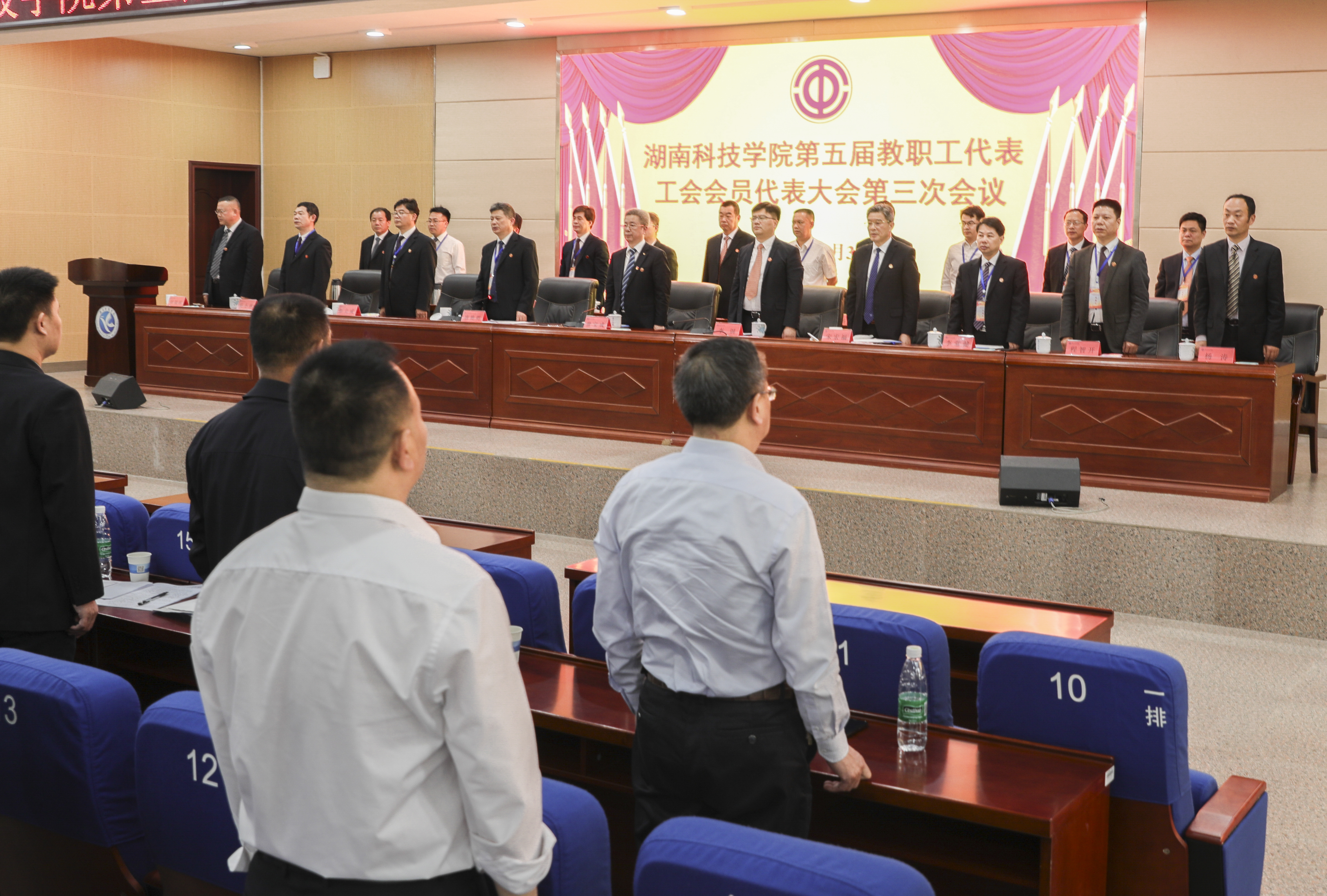 在雄壮的校歌声中,第五届教职工代表工会会员代表大会第三次会议胜利闭幕。