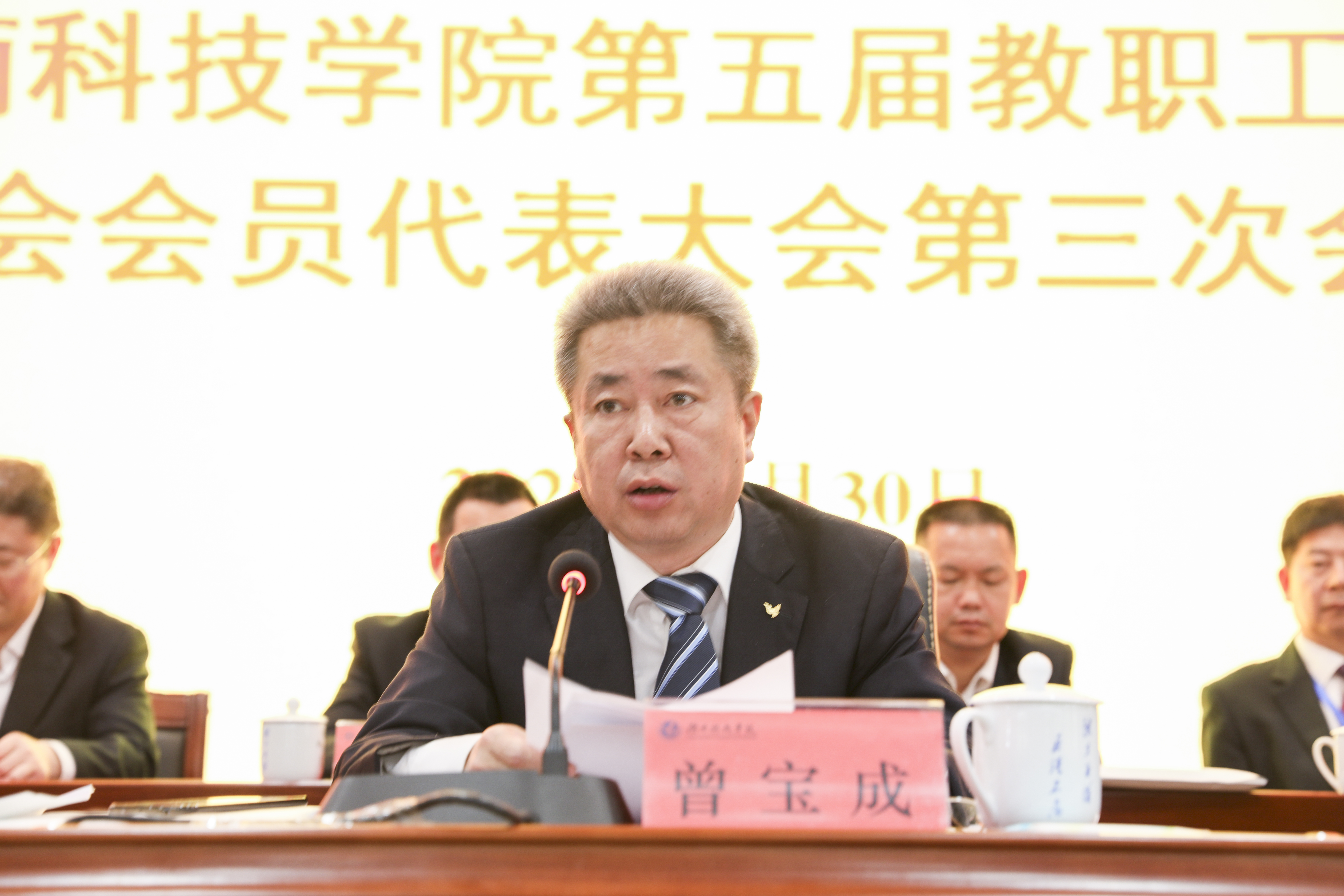 曾宝成作总结讲话。他说,会议期间,各位代表集思广益、畅所欲言,提出的建设性意见集中反映了广大教职员工的心声,体现了大家对加快推进学校内涵式发展、跨越式发展的热切期盼。他希望大家珍惜广大师生员工的信任和重托,始终情系教育解难题,真诚履职求实效,为学校事业发展积极贡献。