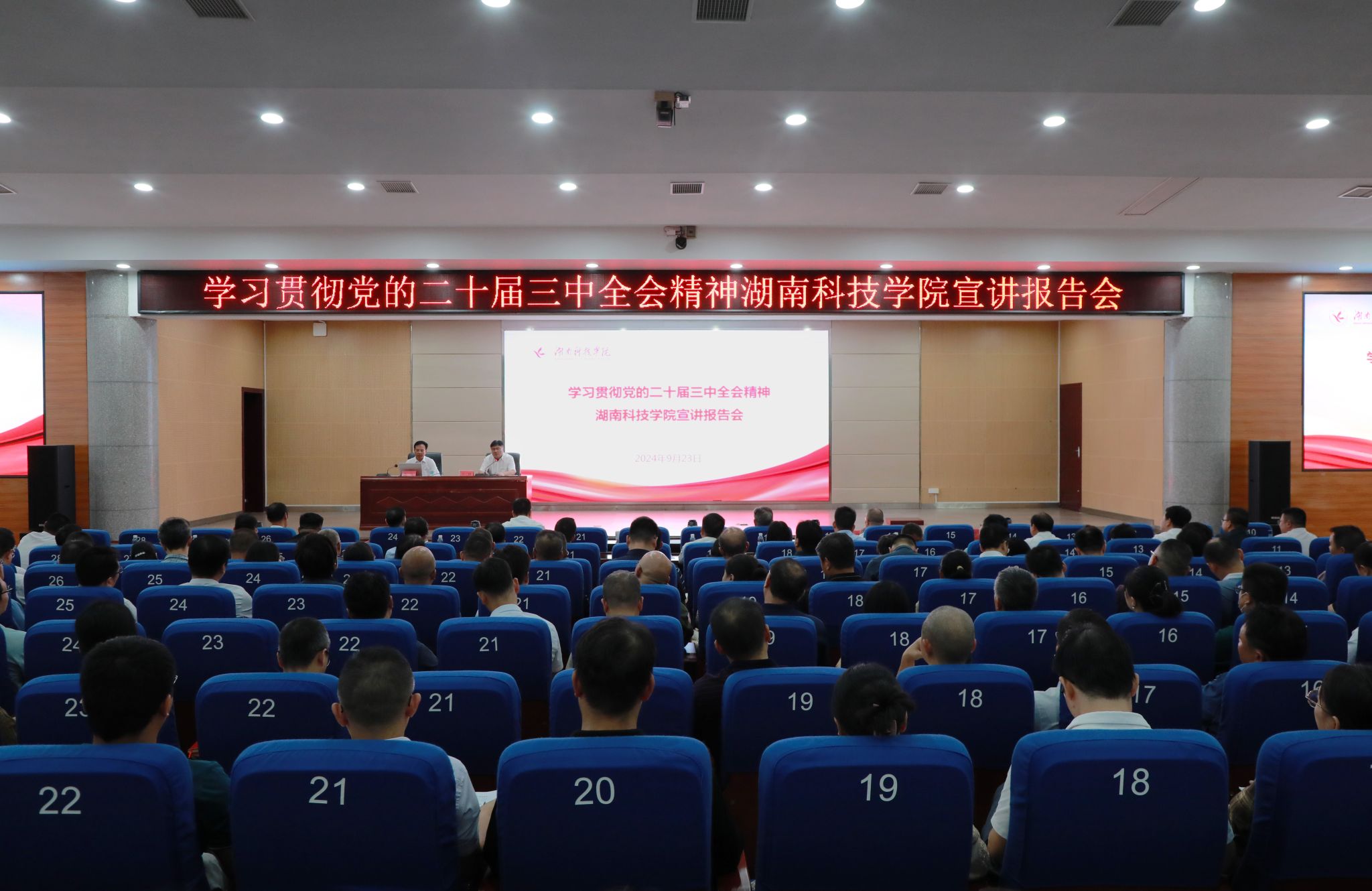 本网讯(记者 向薛峰 摄影 谢志豪)9月23日,学校举行学习贯彻党的二十届三中全会精神宣讲报告会暨党委理论学习中心组(扩大)第8次集体学习,湖南农业大学党委书记陈弘应邀来校作专题宣讲报告,全体在校党委委员、校领导,全体中层干部,机关副科级以上干部,全体辅导员,马克思主义学院教师以及学生代表共450余人参加会议,会议由校党委书记李钢主持。