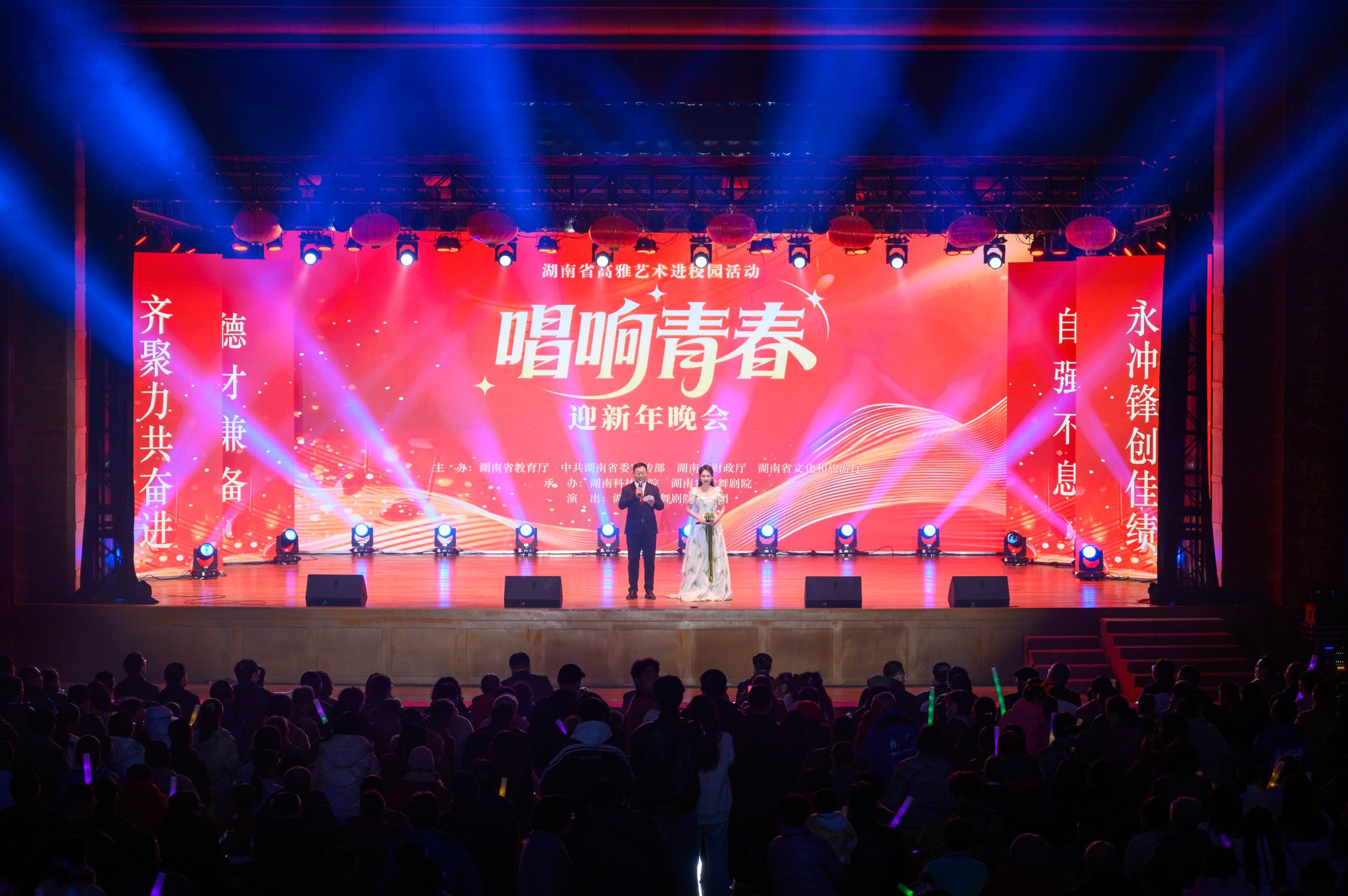 本网讯(记者 谷利梅 蔡汝佳)12月28日晚,我校举行2026年“唱响青春”迎新年晚会。本次活动由我校和湖南省歌舞剧院共同承办。永州市政协党组成员、副主席蒋井泉,零陵区委书记赵立平,冷水滩区委书记李辉,校党委书记李钢,党委副书记、校长黄创霞等全体在校校领导出席活动,与全体教职员工、离退休老同志及学生代表共迎新年。李钢为本次新年晚会致辞。
