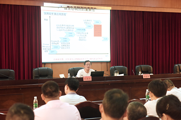 座谈会后,印遇龙院士作了题为“畜禽微生态制剂综合利用技术研发与应用进展”的学术报告,整场报告深入浅出,用丰富的科研应用实践、详实的数据展示了畜禽绿色养殖的最新研究成果,描述了畜禽微生态研发的广阔应用前景。印遇龙院士围绕微生态制剂的重要性与微生态制剂研究进展两大方面,深刻阐述了用微生态制剂替代抗生素的重大意义和作用机理。同时还就益生菌、益生元、合生元等微生态研究的主要进展进行了介绍,报告会上印遇龙院士还与大家进行了精彩互动。