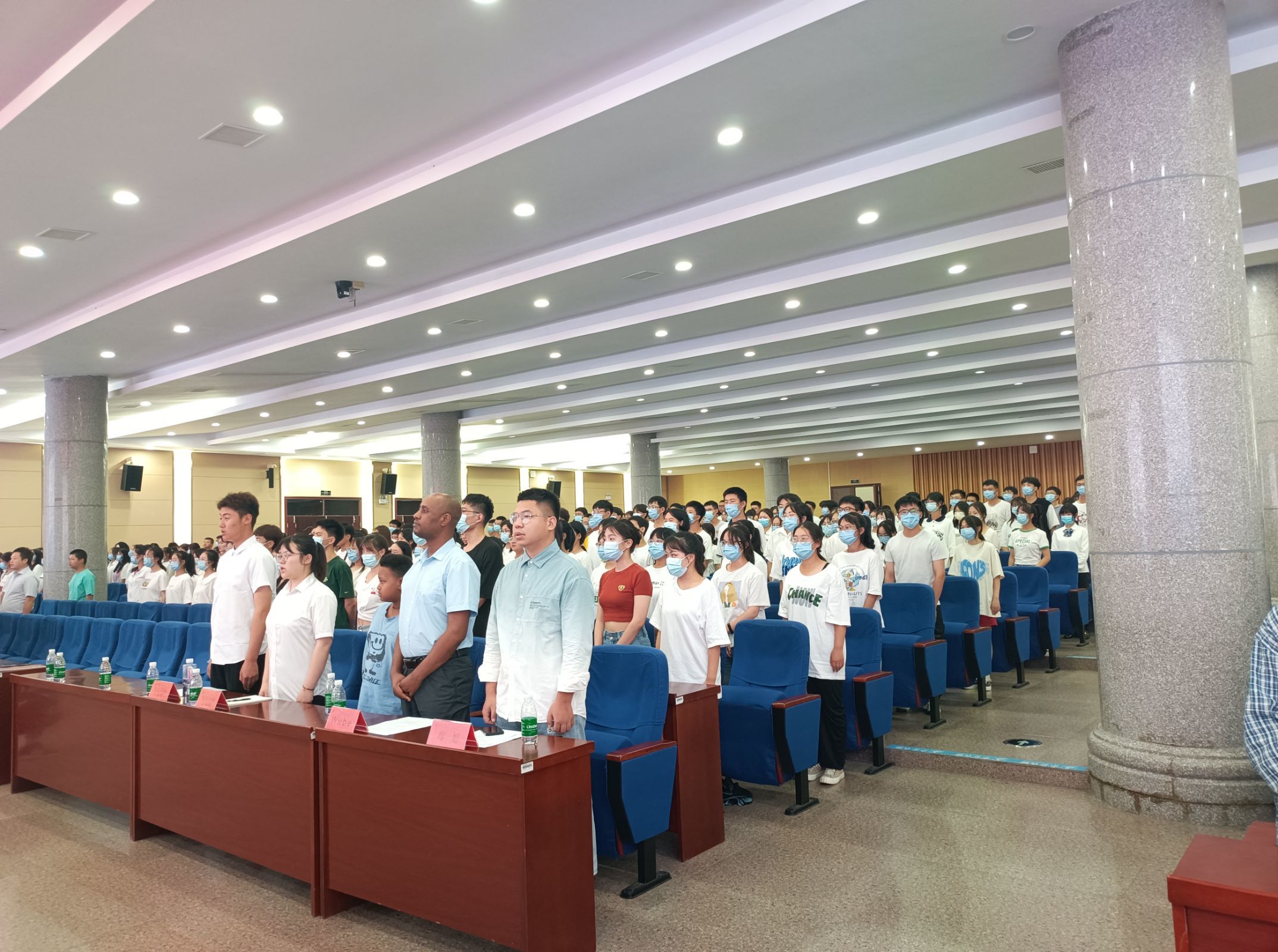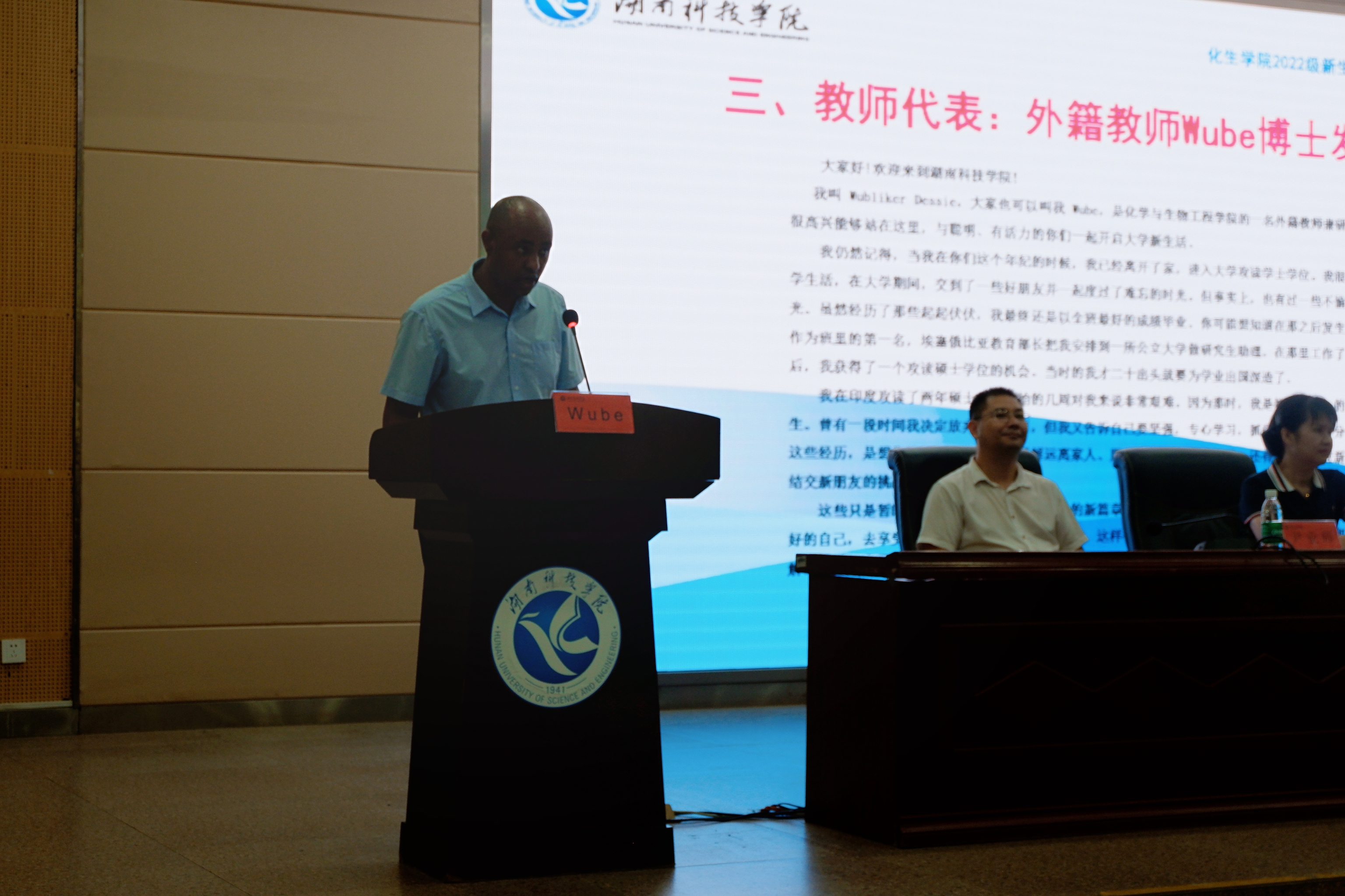 在雄壮的国歌声中,见面会正式拉开帷幕,教师代表上台与全体新生见面并进行发言。新生班主任代表廖旭博士结合自己的读博经历与同学们共勉,希望同学们能树立明确的目标,成为勇担国家重任的新时代青年。随后外籍教师代表wube博士上台寄语新生。Wube博士用流利的英文讲述了他的异国求学经历,远离家乡的乡愁、适应新环境的挑战及学习生活中的困难,Wube博士最后鼓励同学们克服困难、迎接挑战,战胜自我。