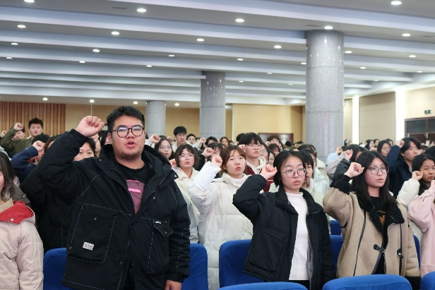 优秀学生代表周吉森上台发言,表示以学院学风高质量建设为目标,端正学习态度、追求卓越,形成示范引领作用最后带领全体学生进行宣誓。