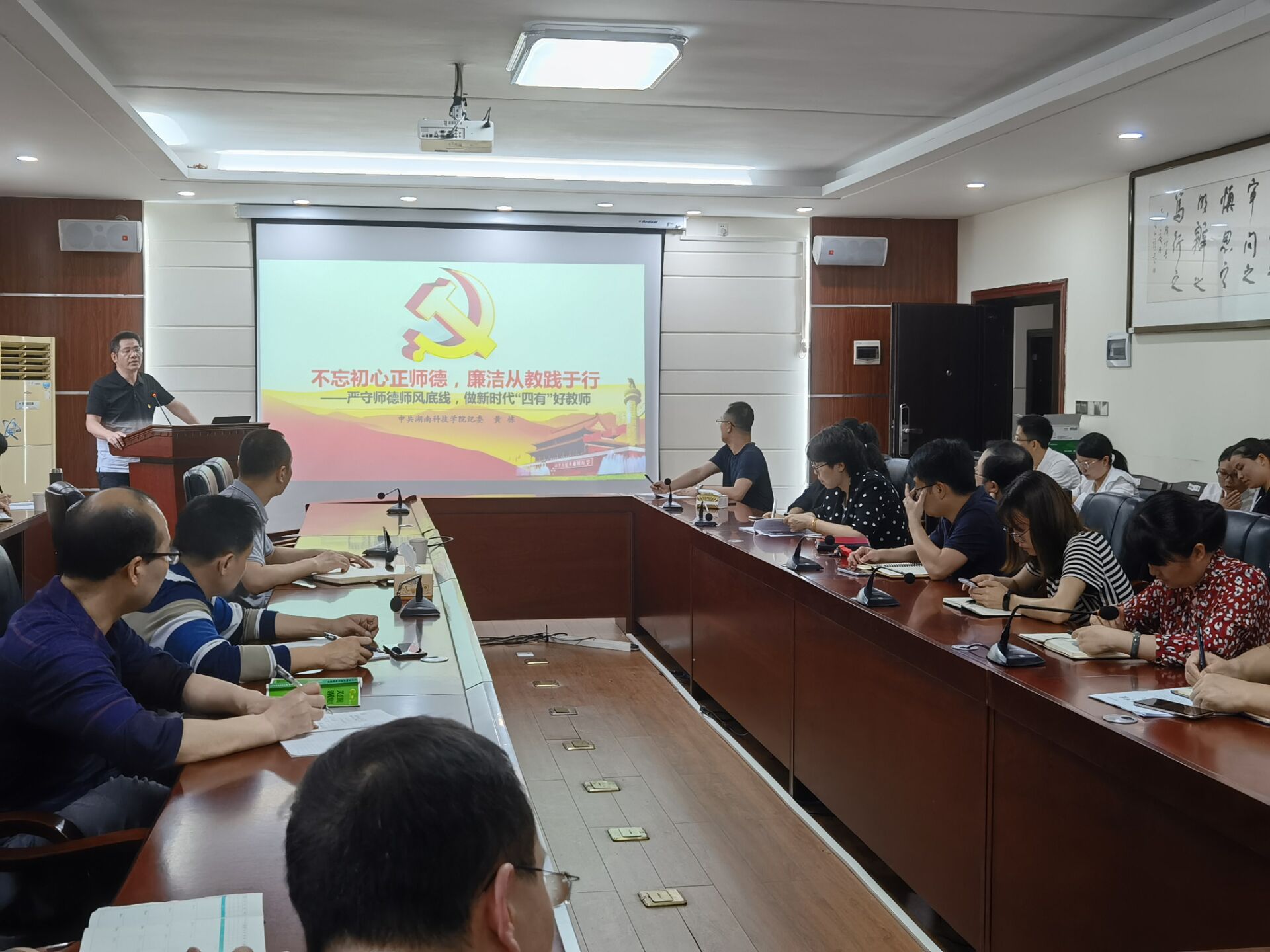 化学与生物工程学院邀请校纪委副书记、监察处处长黄栋为学院全体党员教师上了题为“不忘初心正师德,廉洁从教践于行”的廉政课。他传达全省师德师风建设工作视频会主要精神,分析了加强师德师风建设的重要性和紧迫性,研判了当前师德师风方面存在的7个突出问题。他指出党员教师要加强党性修养,以更加饱满的精神和坚定务实的作风践行党员干部的使命担当。党员教师要不忘初心,廉洁从教,树立良好的师德师风,为学生们立榜样、做模范。