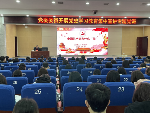 4月27日下午,校党委委员、副校长何福林为化生学院党总支、理学院党总支和机关第六党支部全体师生党员上党史学习教育专题党课。