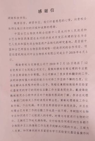 本网讯 7月22日,化学与生物工程学院收到一封来自永州中古生物技术有限公司的感谢信,点赞学院毕业生。