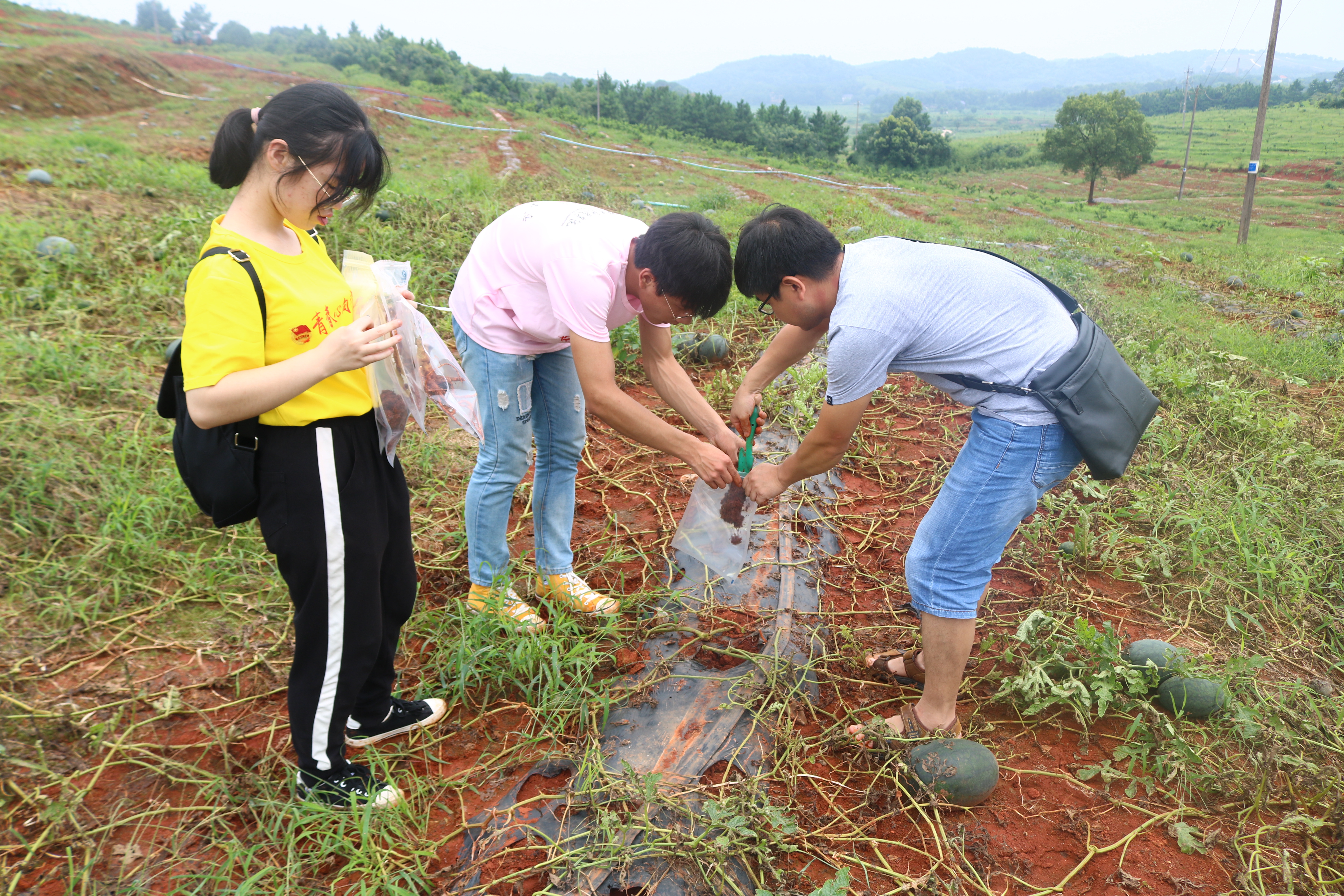 在伊塘西瓜标准化种植产业园,带队老师袁志辉博士就土壤消毒技术的原理及应用前景进行介绍,强调土壤消毒技术可以有效的防治土传病害。志愿者根据前期培训和讲解,结合西瓜的种植特点,卷起裤脚,撸起袖子,瓜田实地采摘西瓜、收集腐烂的瓜藤与土壤样本,现场问诊,探讨连作植物土壤病毒滋生的原因及可行性解决办法。志愿者组成技术帮扶小组,指导瓜农科学化生产、定期进行土质检测,并现场进行了土壤消毒的示范。