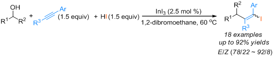 吴超博士以来源易得的芳香仲醇、炔烃和廉价的氢碘酸作为原料,以高收率的制备了结构多样性的烯基碘衍生物。该研究成果“Direct synthesis of alkenyl iodides via indium-catalyzed iodoalkylation of alkynes with alcohols and aqueous HI”以我校为唯一通讯单位发表在英国皇家学会Organic & Biomolecular Chemistry期刊(Org. Biomol. Chem., 2018,16, 3177,中科院化学大类二区)。