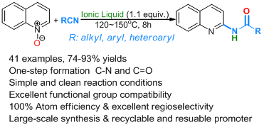 谢龙勇博士以来源易得的喹啉氮氧化物和廉价的腈类化合物作为原料,以100%的原子效率,无溶剂条件下高收率的制备了结构多样性的N-(喹啉-2-基)羧酰胺衍生物。该研究成果以我校为唯一通讯单位,“Brønsted Acidic Ionic Liquid-Promoted Amidation of Quinoline N‑Oxides with Nitriles”发表在美国化学会ACS Sustainable Chem. Eng.期刊(中科院分区化学大类二区,影响因子5.951)。值得一提的该论文从投稿到接收,仅历时125小时,未经论文外审。据了解,仅个别极其优秀且符合期刊定位的研究工作,经美国化学会期刊编辑部全体编辑讨论,并获得一致同意后可不经同行评议直接发表。
