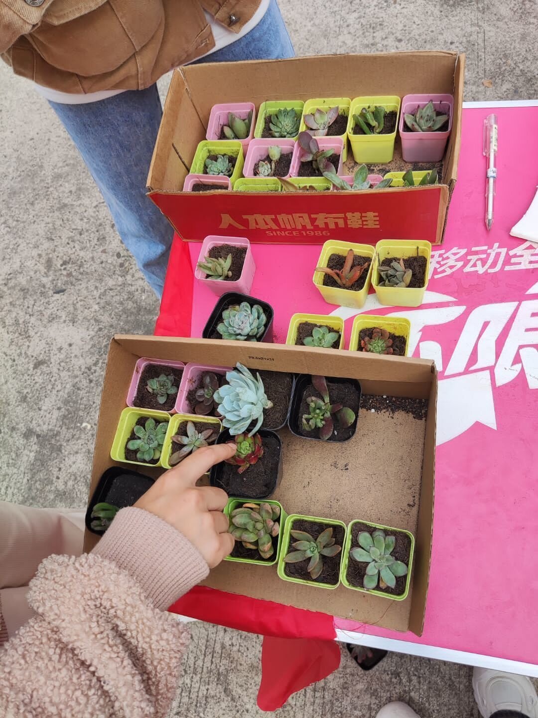 活动开始前,同学们收集了许多废弃的快递盒,用来换取饱满的绿植。活动进行中,桌子上整齐地摆放着一盆盆绿植,同学们井然有序的将快递盒交给工作人员后,精心挑选多肉在留言板上写下自己的环保宣言签名