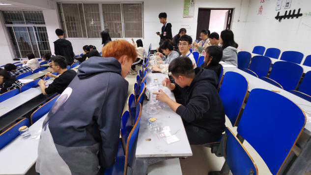 首先协会干事为同学们讲解天气瓶的由来、反应原理和天气瓶的制作方法以及制作过程中应该注意的事项。讲解结束后,同学们开始动手制作。在制作过程中,协会成员细心指导,在大家的共同努力下,同学们完成了令自己满意的作品。