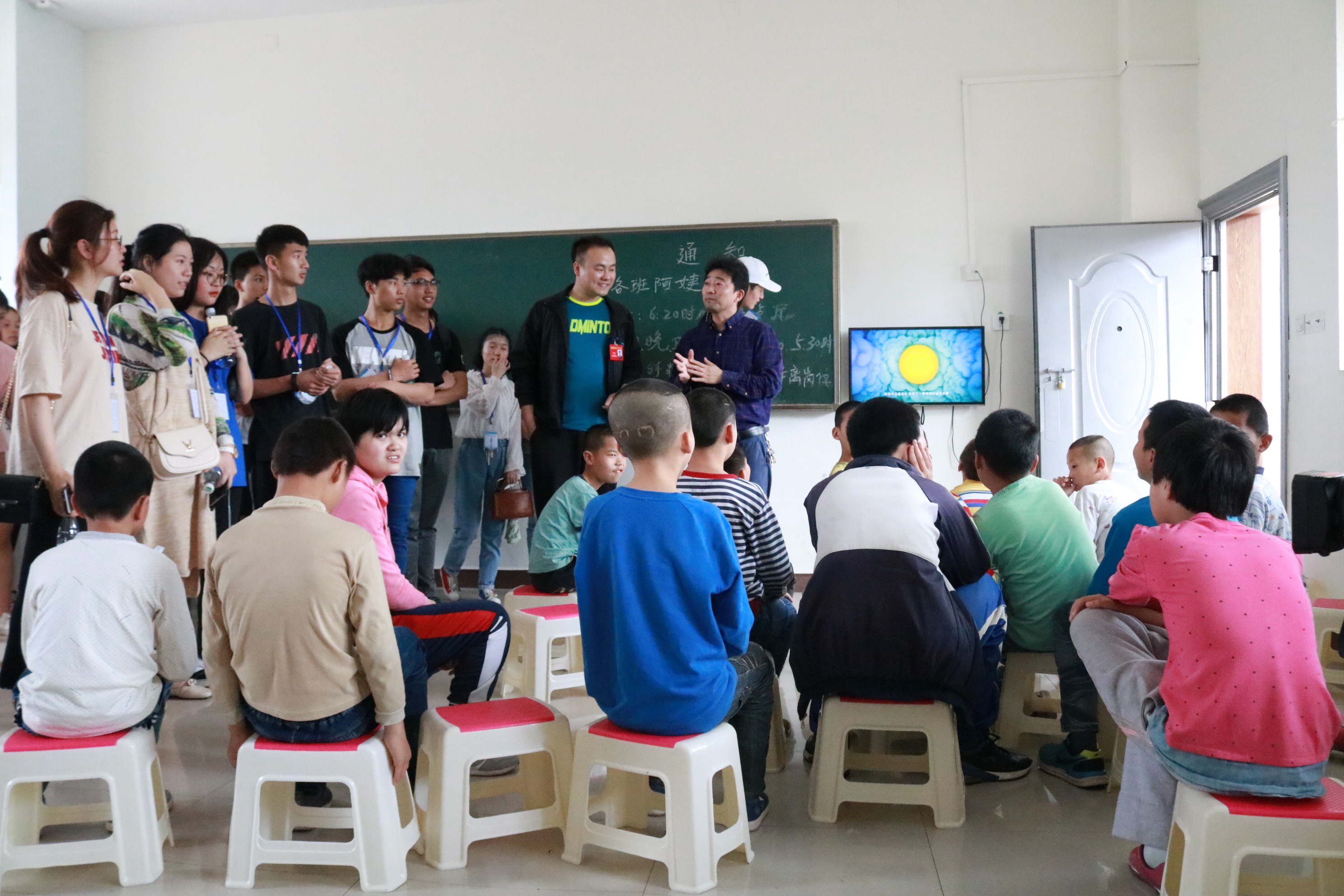 到达目的地后,特殊学校的李老师带领大家参观了画室、教室、宿舍、情景模拟室、活动室。参观活动室时,孩子们正在观看动画片。看到志愿者们进来,孩子们立刻用手语开心地表示欢迎。志愿者们也笑着用之前学到的手语和孩子们进行简单的交流,一个个简单的动作就这样将志愿者们的心与孩子们联系在了一起。