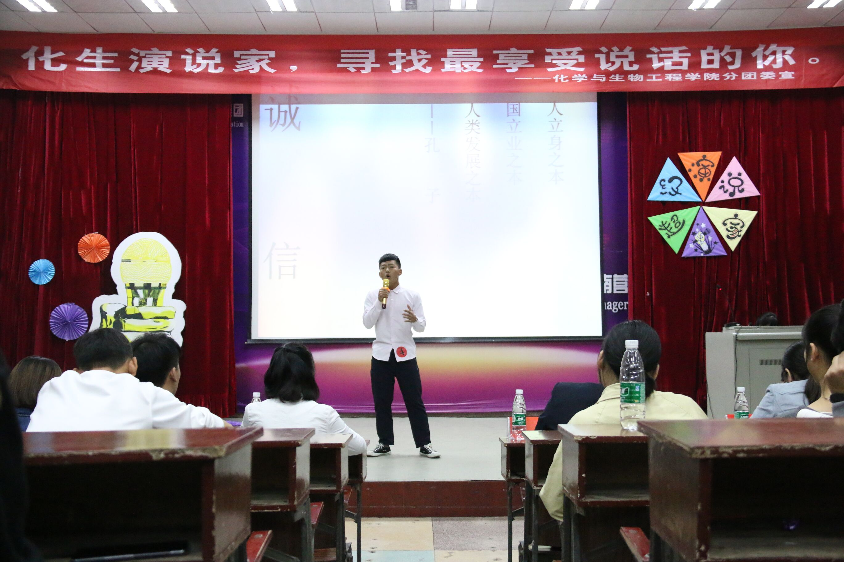 活动伊始,通过初赛、复赛严格选拔出的九位参赛选手按出场顺序依次进行有个性的自我介绍。演讲过程中,各位选手身着正装,精神抖擞,声情并茂地演讲,把现场观众的情绪带入高潮。其中来自生物技术1702班的1号选手李学娇的演讲《骨感理想,丰满现实》颠覆了人们平时的惯性思维;来自化学师范1702班的3号选手朱盈的演讲《春风十里,因为有你》深情地抒发人与人之间友谊的可贵与难得;来自制药1701班的9号选手唐婉婷的演讲《我们的中国梦》激情澎湃地表达了现代年轻人该用怎样的态度对待中国梦。选手们或激昂高亢、或低沉颂吟,用真情实感表达了自己观点,在观众热烈的掌声中,比赛成功落下帷幕。