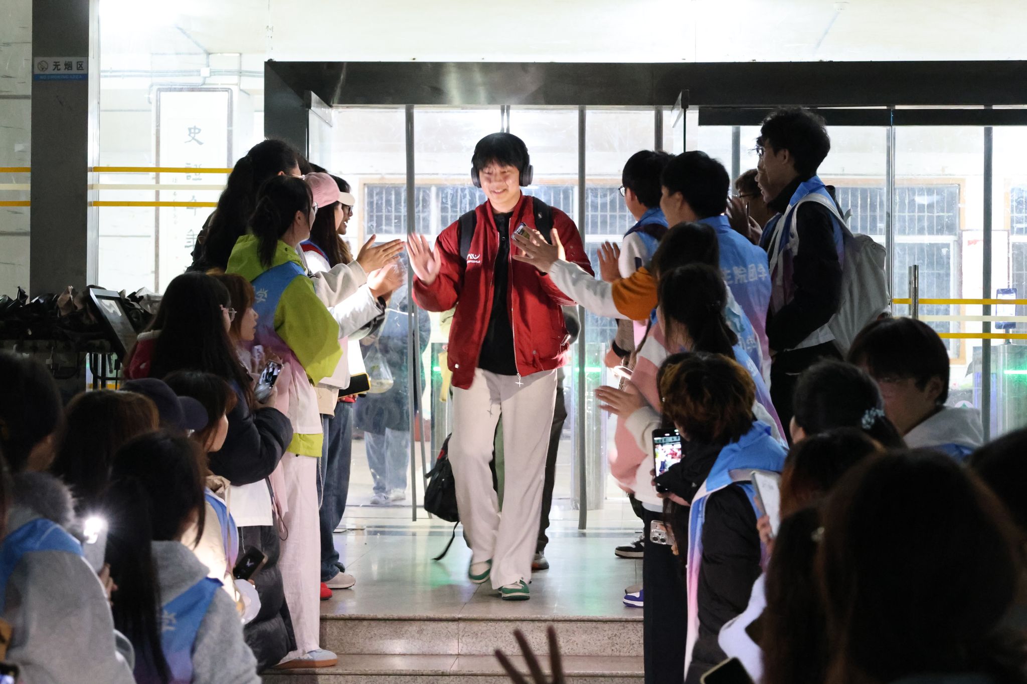 在考研学子步出自习室前,加油团已准备就绪。当学子们陆续走出图书馆时,团学代表们挥动手中的荧光棒,齐声送上诚挚祝福:“学长学姐辛苦了,考研加油!”除此之外,团学代表们分列两侧,伸出双手与每一位经过的考研学子击掌互动。击掌声不仅传递了温暖与力量,更展现了我院师生团结一心的精神风貌。