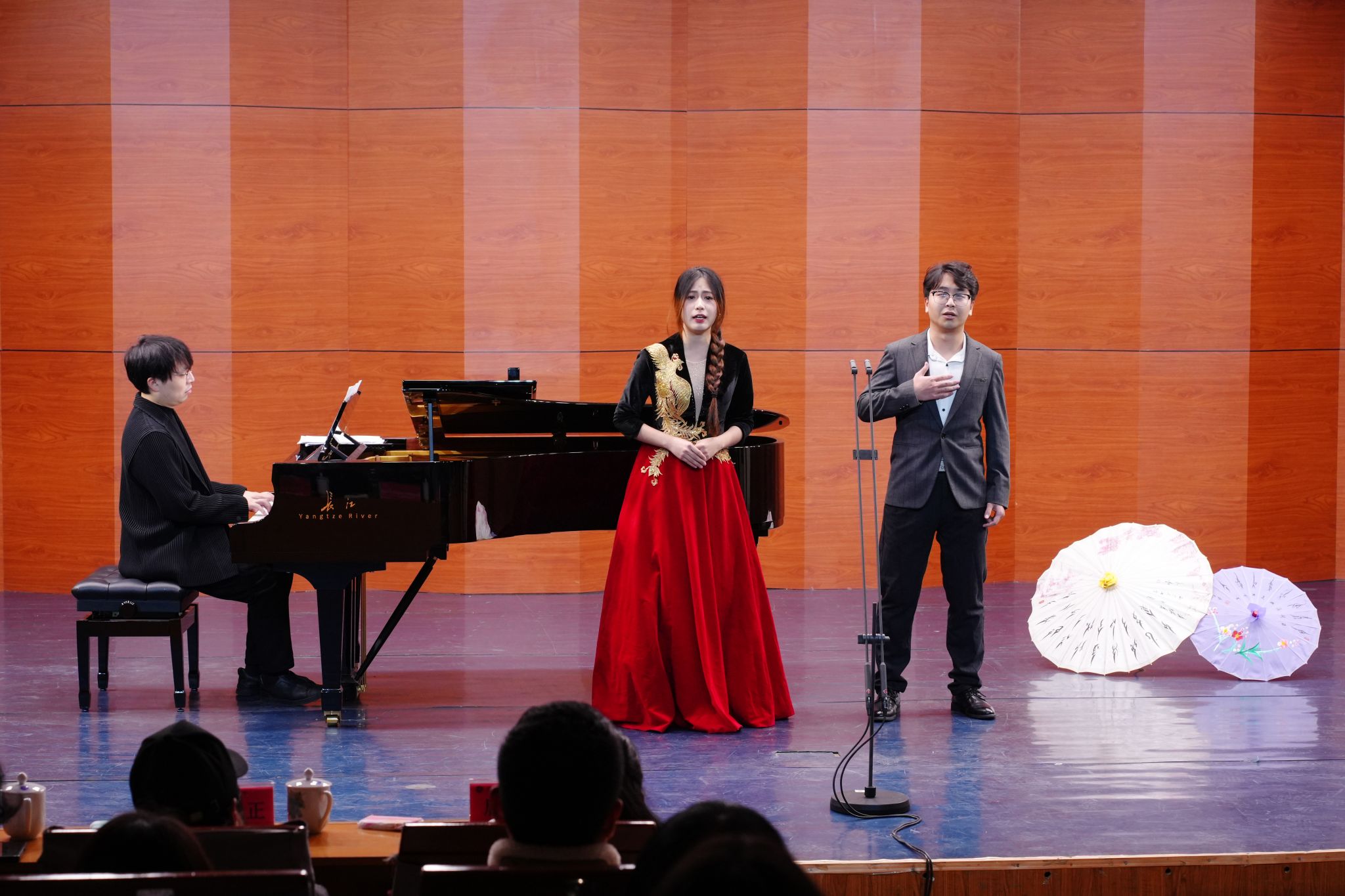 音乐会现场,从柳宗元谪居永州时写下的《零陵早春》和《渔翁》,到气壮山河的《满江红》,以及理学开山周敦颐的散文《爱莲说》,精心筛选的19首曲目全部由我校音乐与舞蹈学院学生担纲演唱,我校恩斯特教授(Prof. Ernst Nolting-Hauff)和武汉音乐学院专任教师杜亦秋担任钢琴伴奏,这种强烈的“沉浸感”与“代入感”,让传统文化变成“耳畔的旋律”。“歌声像一座桥,让我直接走进了诗人的情感世界里。”财管2401班学生谷利梅在观演后说。