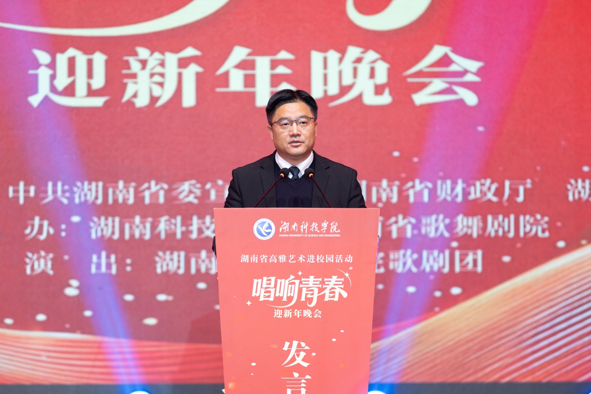本网讯(记者 谷利梅 蔡汝佳)12月28日晚,我校举行2026年“唱响青春”迎新年晚会。本次活动由我校和湖南省歌舞剧院共同承办。永州市政协党组成员、副主席蒋井泉,零陵区委书记赵立平,冷水滩区委书记李辉,校党委书记李钢,党委副书记、校长黄创霞等全体在校校领导出席活动,与全体教职员工、离退休老同志及学生代表共迎新年。李钢为本次新年晚会致辞。