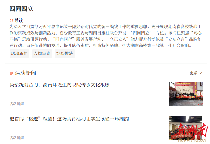 拓展宣传阵地,提升影响力。省委教育工委联合新湖南、省政协融媒体中心开设宣传专栏,全方位报道“四同四立”活动成效,谋划推出《同心筑梦:统战力量赋能大学生创新创业》视频访谈节目。各高校运用新媒体打造“同心微课堂”“统战故事汇”等线上品牌,以短视频、直播等鲜活形式传播统战知识、讲好同心故事,让统一战线的凝聚力持续增强。