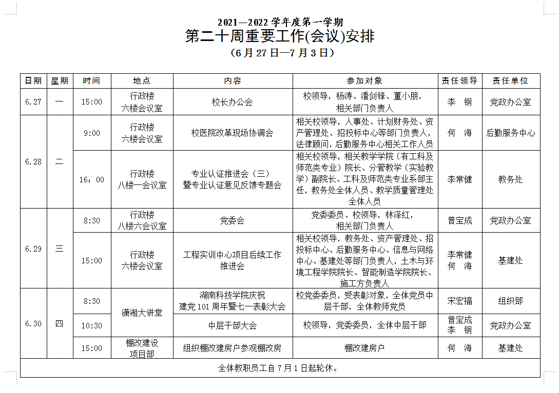 [党政办]第二十周重要工作(会议)安排(6月27日—7月3日)