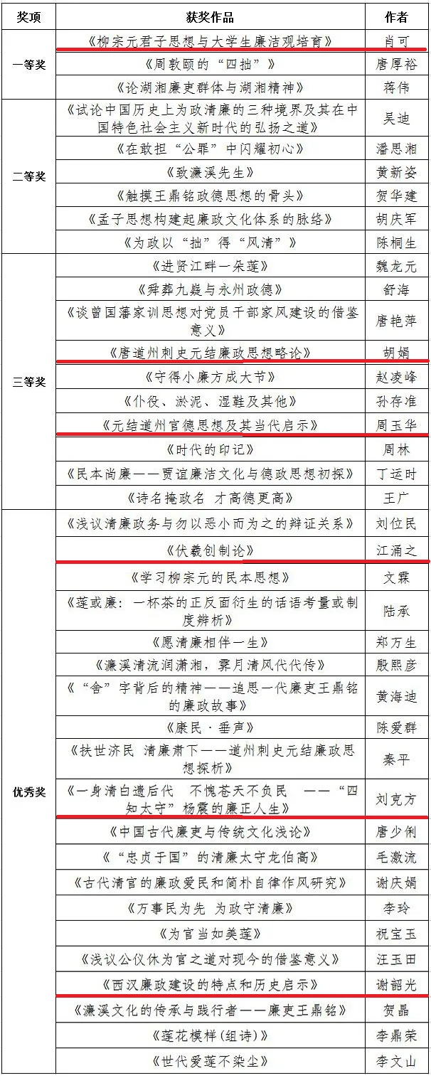 本网讯 近日,由永州市纪委监委和永州市文联共同举办,道县纪委监委承办的“濂溪杯”征文比赛活动评选结果出炉。我校共有7名教师获奖,其中肖可荣获一等奖,胡娟、周玉华、舒海荣获三等奖;江涌之、刘克方、谢韶光荣获优秀奖。