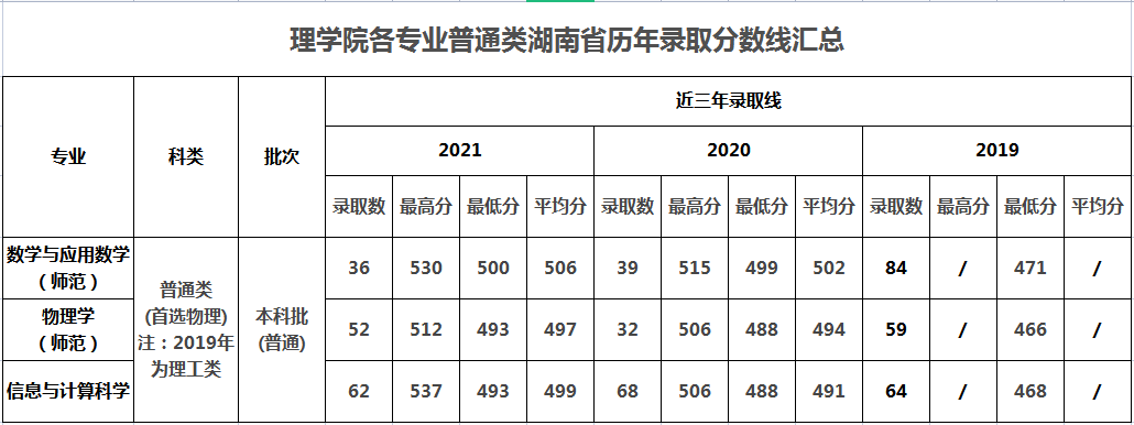 理学院各专业普通类湖南省近几年录取分数线汇总