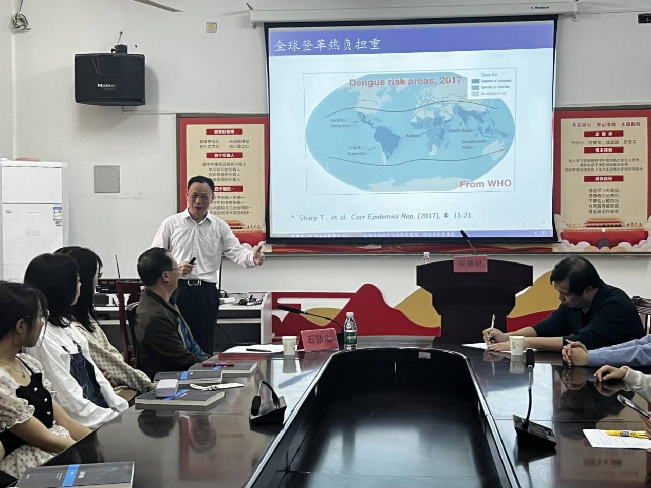 在讲座中,庾建设首先由蚊媒的生物背景以及登革热疫情讲解了蚊媒的危害,阐述了登革热症状和防控现状。接着,运用数学建模中的离散模型知识建立数学模型进行求解,让师生们知道如何在实际问题中应用模型。最后,在原有模型的推论下进行了新的数据分析以及问题讨论。在场的师生积极有序地提问和发言,整个讲座氛围十分融洽。