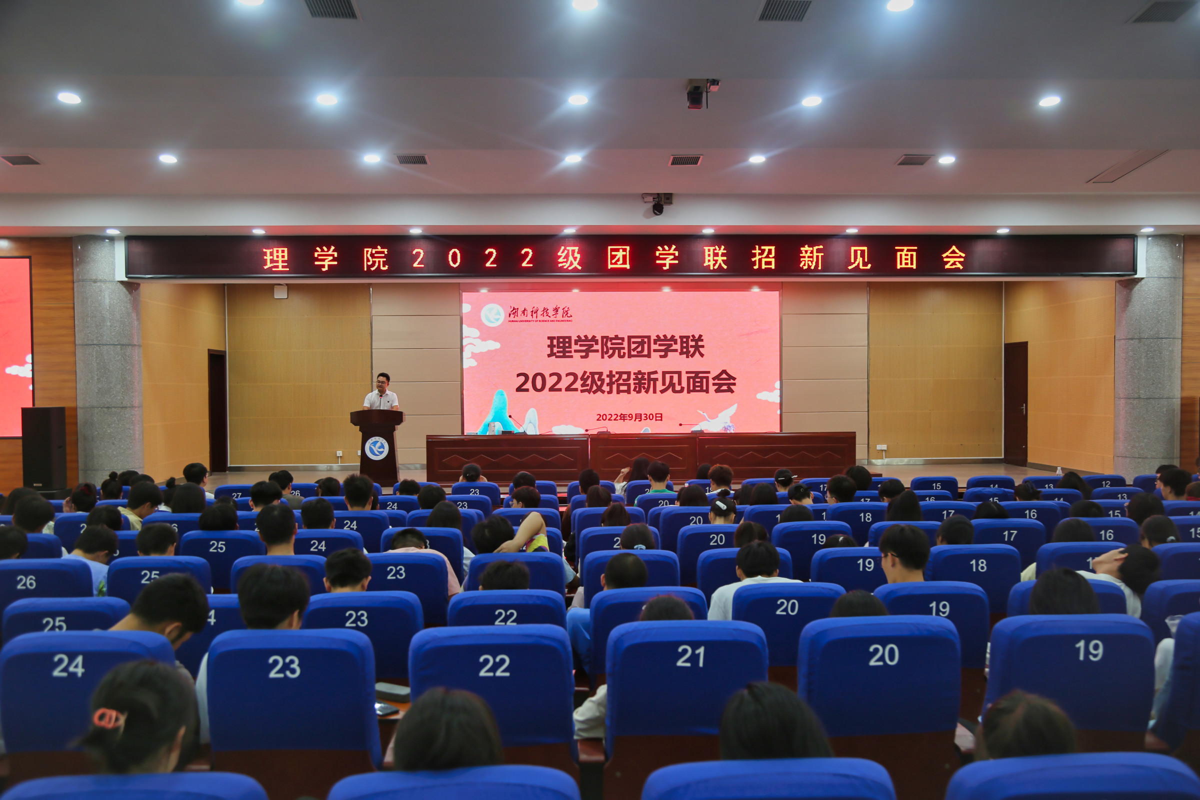 本网讯(通讯员 罗宗爱)9月30日,理学院2022级新生团学联招新大会在潇湘大讲堂举行,党总支副书记副院长欧阳素勤、团总支书记杜俊杰、各年级辅导员出席大会,全体2022级学生、上届学生干部参加,由学生会主席周佳怡主持。