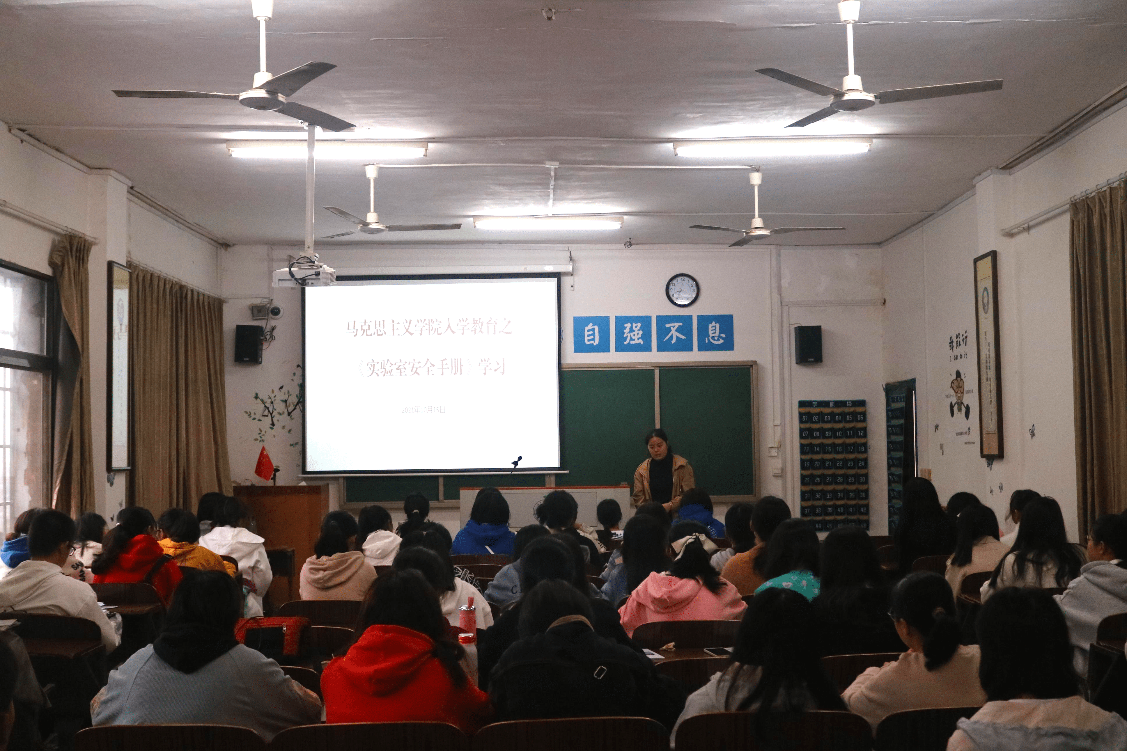 本网讯(记者 张一帆)“作为一名大学生,一定要牢牢树立安全意识,对自己和他人的安全负责。”10月15日,马克思主义学院于鹤鸣楼501教室开展《实验室安全手册》学习活动,21级辅导员胡非对全体21级学生语重心长的说到。