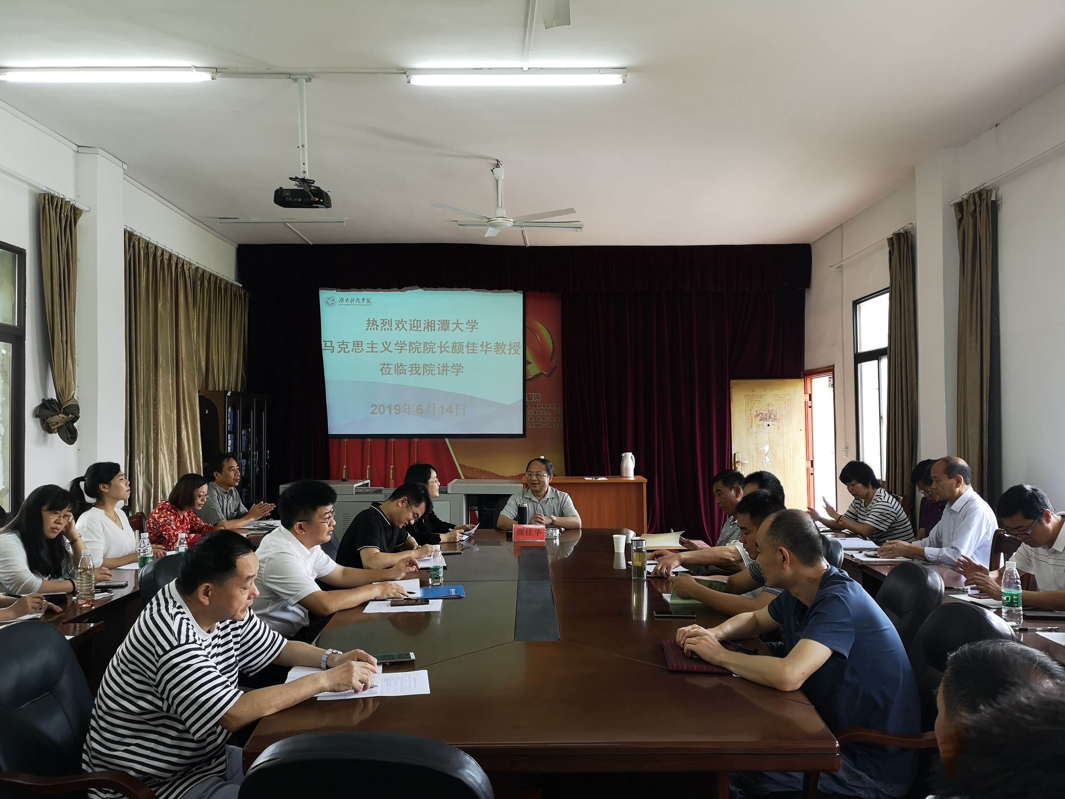 本网讯(通讯员 李艳)6月14日上午,应我校邀请,湘潭大学马克思主义学院院长、博士生导师、湘潭大学学报(哲学社会科学版)主编颜佳华教授莅临我院指导学科建设。座谈会由廖雅琴院长主持,马克思主义学院全体教师出席。