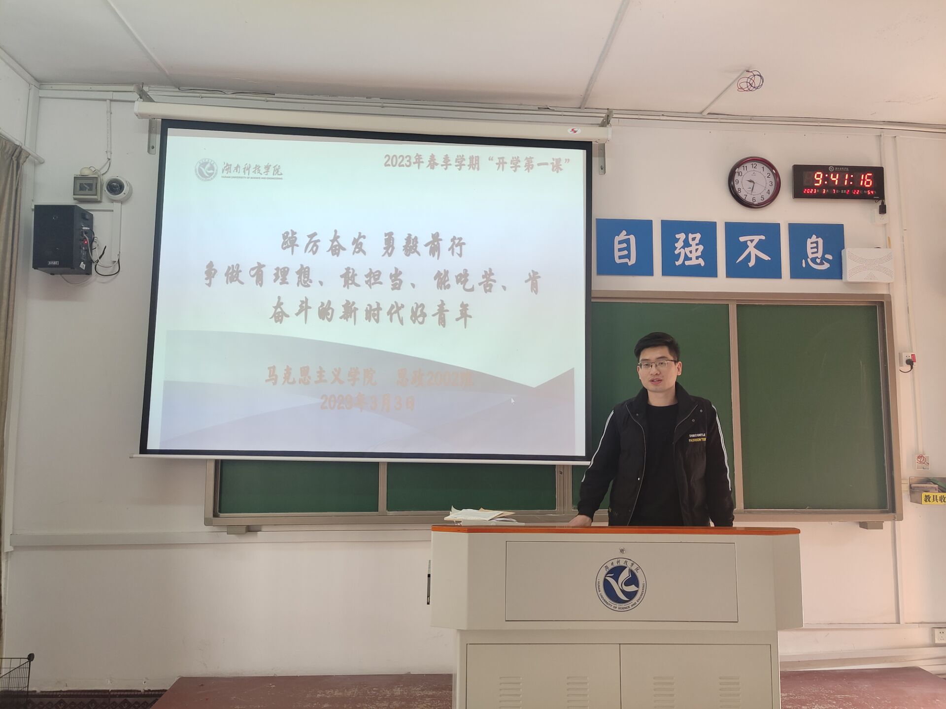 思政2002班班主任何宝君老师说:“希望通过此次主题班会,帮助同学们明确本学期学习目标,同时树立高度安全意识,同学们一定要在日常生活中加强理论知识的学习,关心国家大事,与时俱进的学习时事政策,争当理论学习的排头兵和志愿服务的践行者。”
