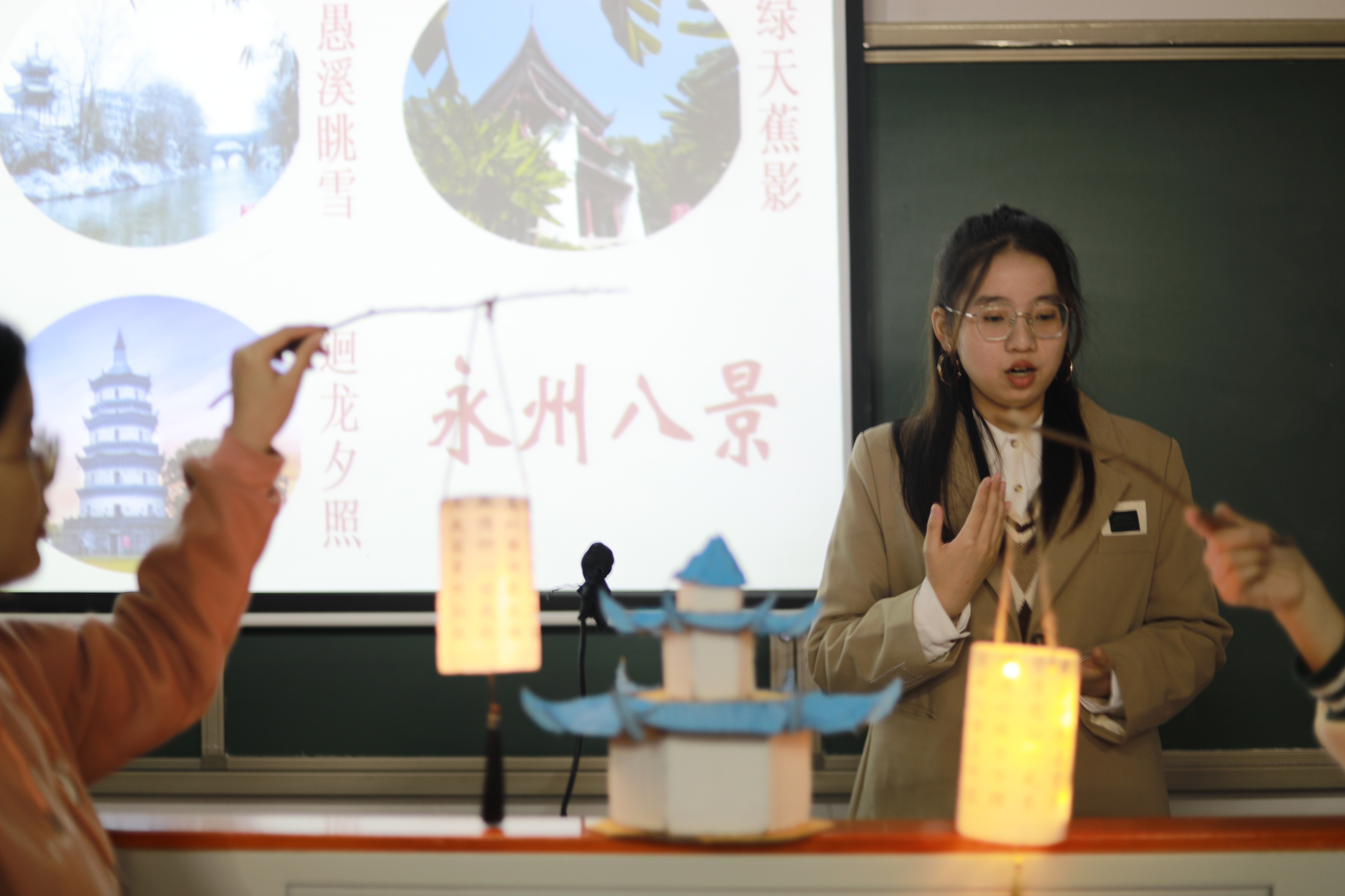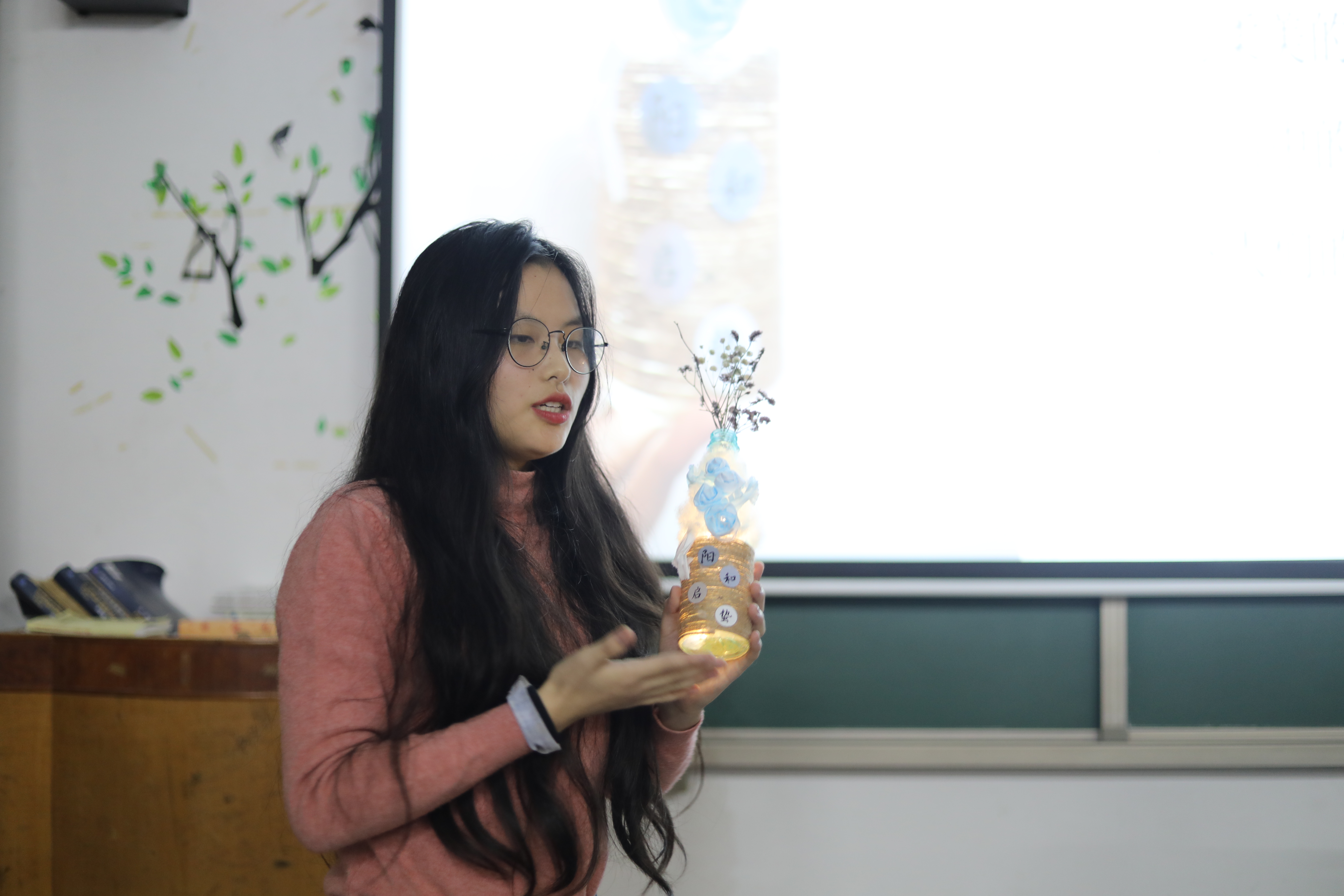 伍子依组以废弃的口罩为画布,用彩笔描摹出疫情管控期同学们的日常生活,她们希望能够将这段共克时艰的美好回忆珍藏下来;何婷婷组则用过期腮红和卫生纸叠出一束花蕾满枝的玫瑰花,“却疑桃李夸三色,得占春光第一香”,她们以这样的方式鼓励同学们要以乐观的态度面对疫情,做到在疫情期间不荒废时光;李钰晨组以永州八景之一的“迴龙夕照”为灵感,用废纸箱和塑料瓶为原材料制作出宝塔和古风灯笼,二者相映成趣,意在倡导同学们在疫情期间我们应该节约资源,低碳生活,也要坚信只要大家齐心协力,众志成“塔”,疫情的阴霾终将被驱散。