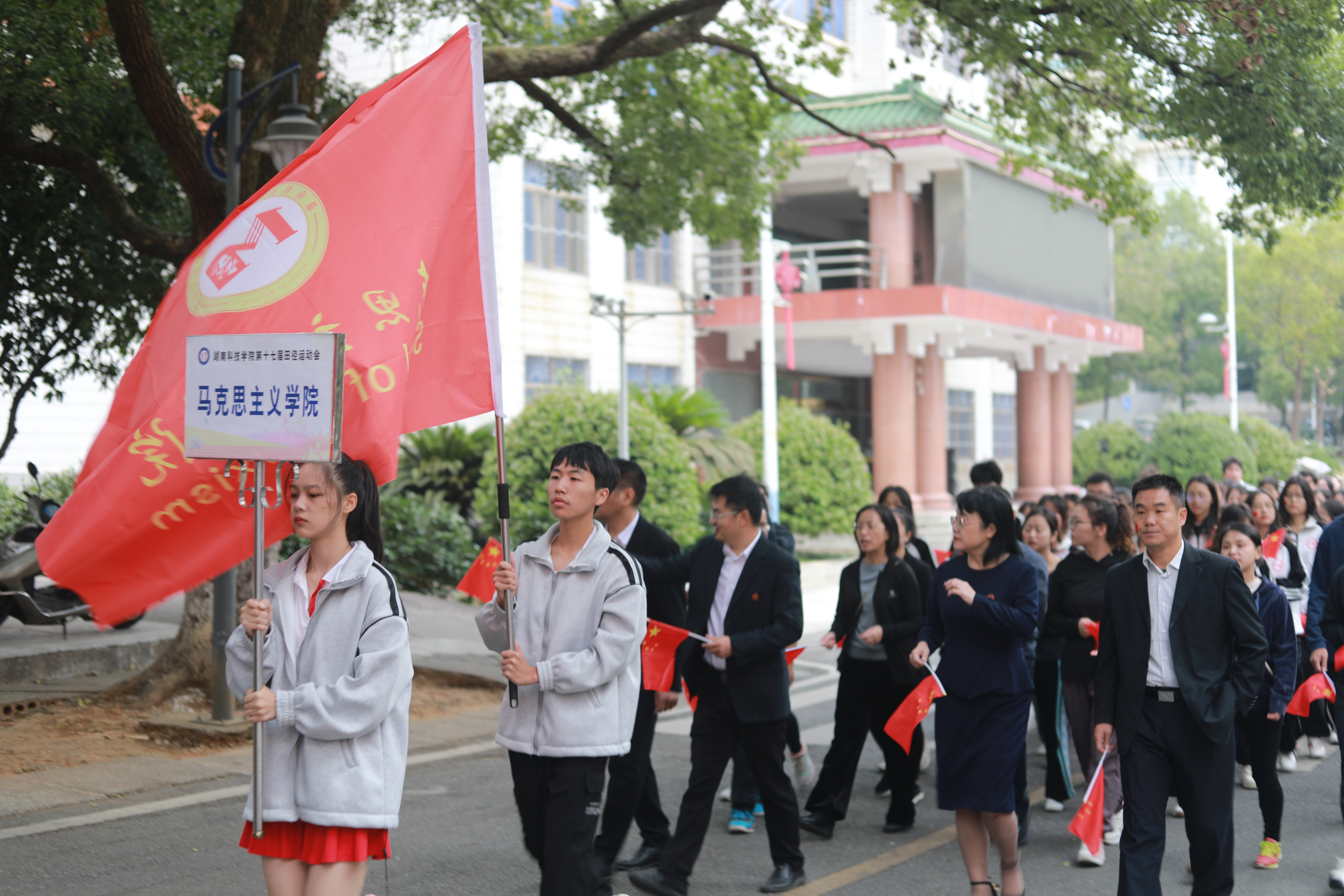 随着音乐声响起,各个学院队伍依次入场,我院方阵服装统一,手持小红旗,意气风发,激动地喊出“百炼成钢,青春激扬,筑梦马院,共创辉煌”这一嘹亮口号,迈着整齐的步伐通过主席台,展现出朝气与活力。
