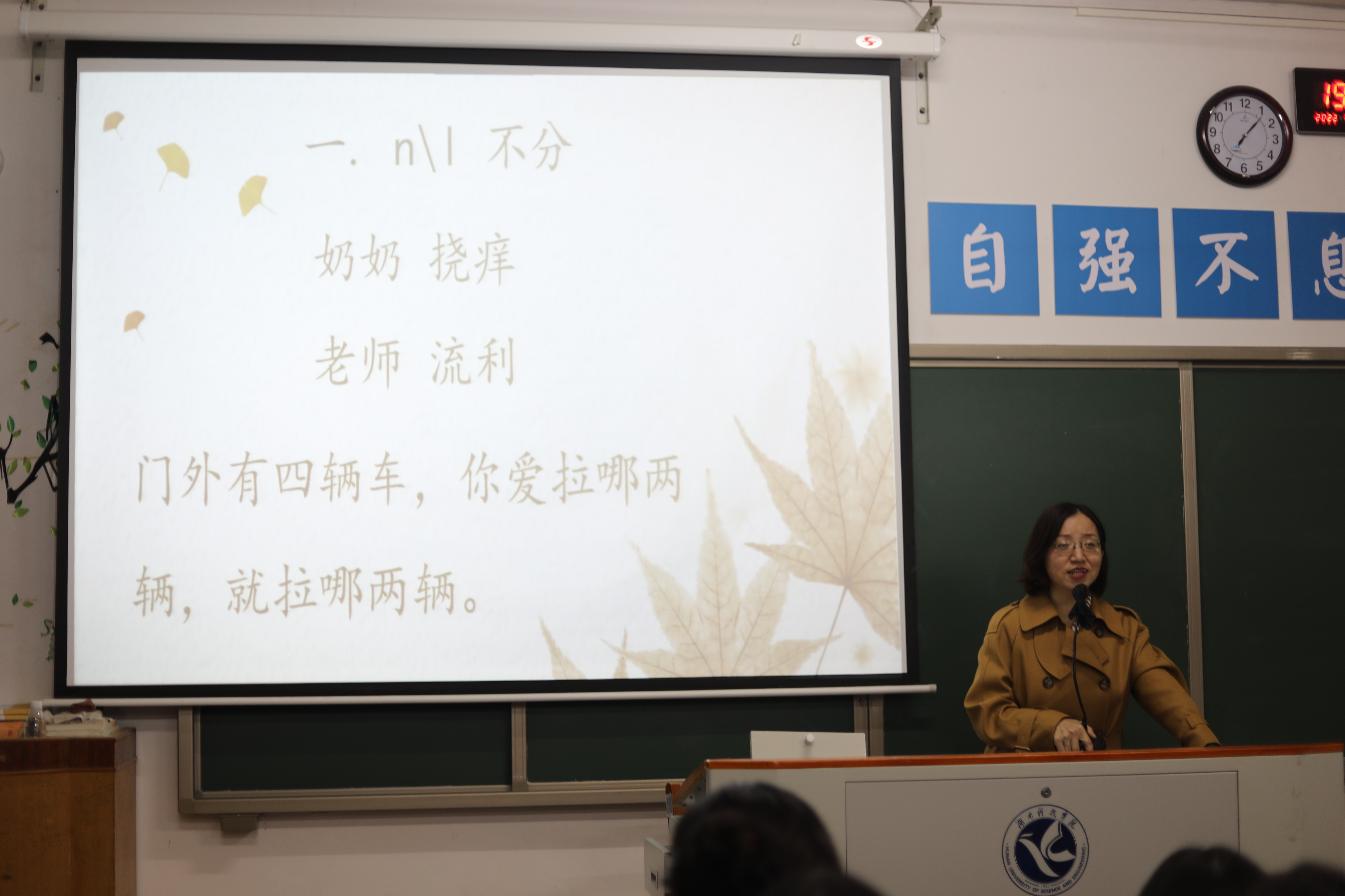 活动伊始,徐老师引导同学们开口尝试绕口令,目的是让同学们在读的过程中感受到普通话的魅力与难度。随后,徐老师强调同学们要注重基础,回归教材,多熟悉课文,以达到流利朗诵,要注重训练调值,以达到抑扬顿挫。最后,徐耀君老师分享了口舌操训练方法,命题说话的技巧和注意事项。
