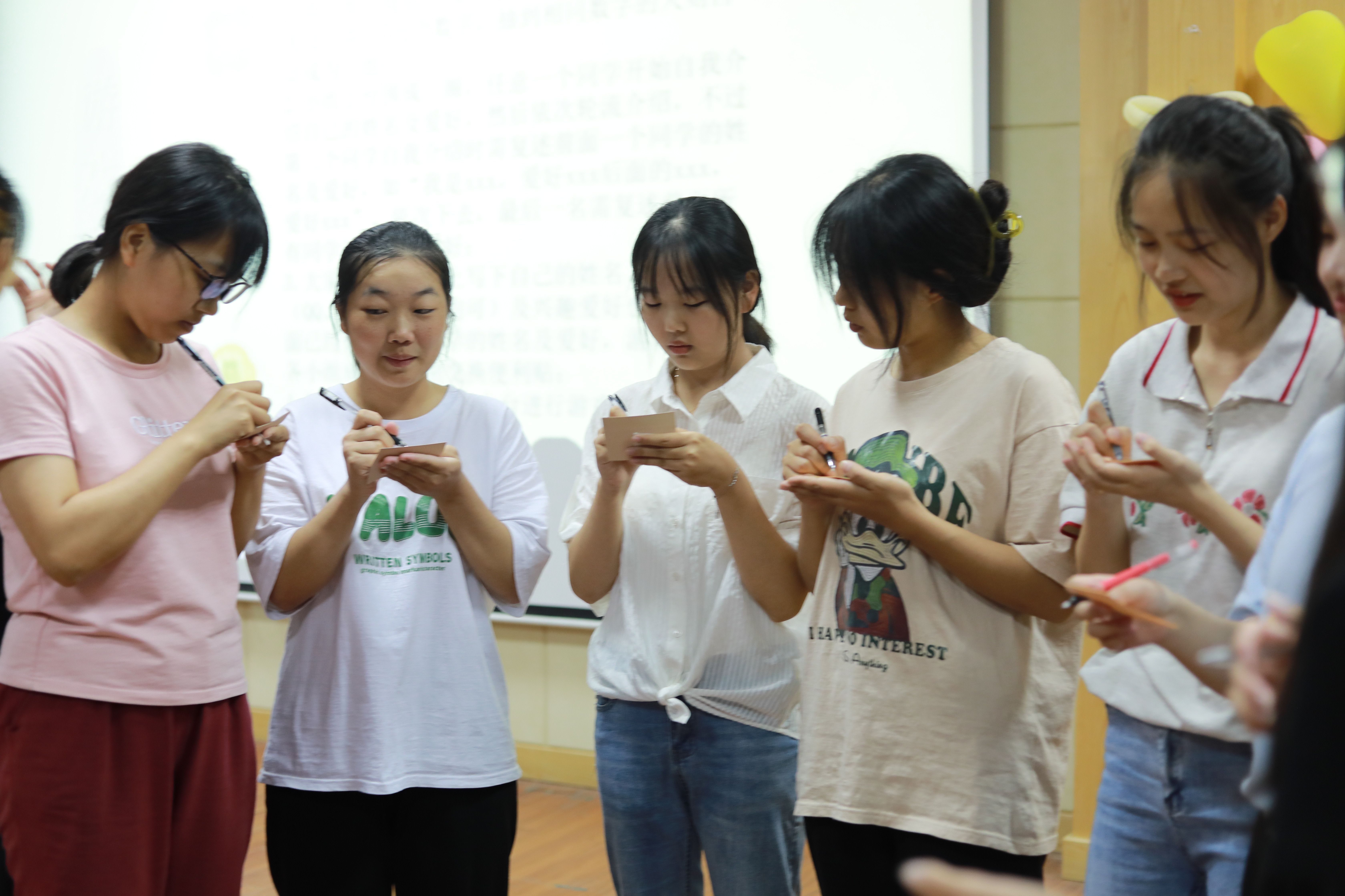 “名字串一串,谁和我一样”,在开场游戏中,大家围成一圈,向同学们介绍自己的兴趣爱好,而接下来的同学在自我介绍的同时也需要陈述上一个同学的兴趣爱好。“你也喜欢跳舞!加个好友啊!”迅速拉近了彼此的距离。游戏“盲人与拐杖”更是考验起同学们的默契与配合,过程更是让人感到浓浓温暖;“五湖四海一条心”团队合作模式的沉浸体验,更是增进了同学们之间的信任感;“信封漂流”通过写信的方式,让同学们更加了解彼此,情谊进一步加深。