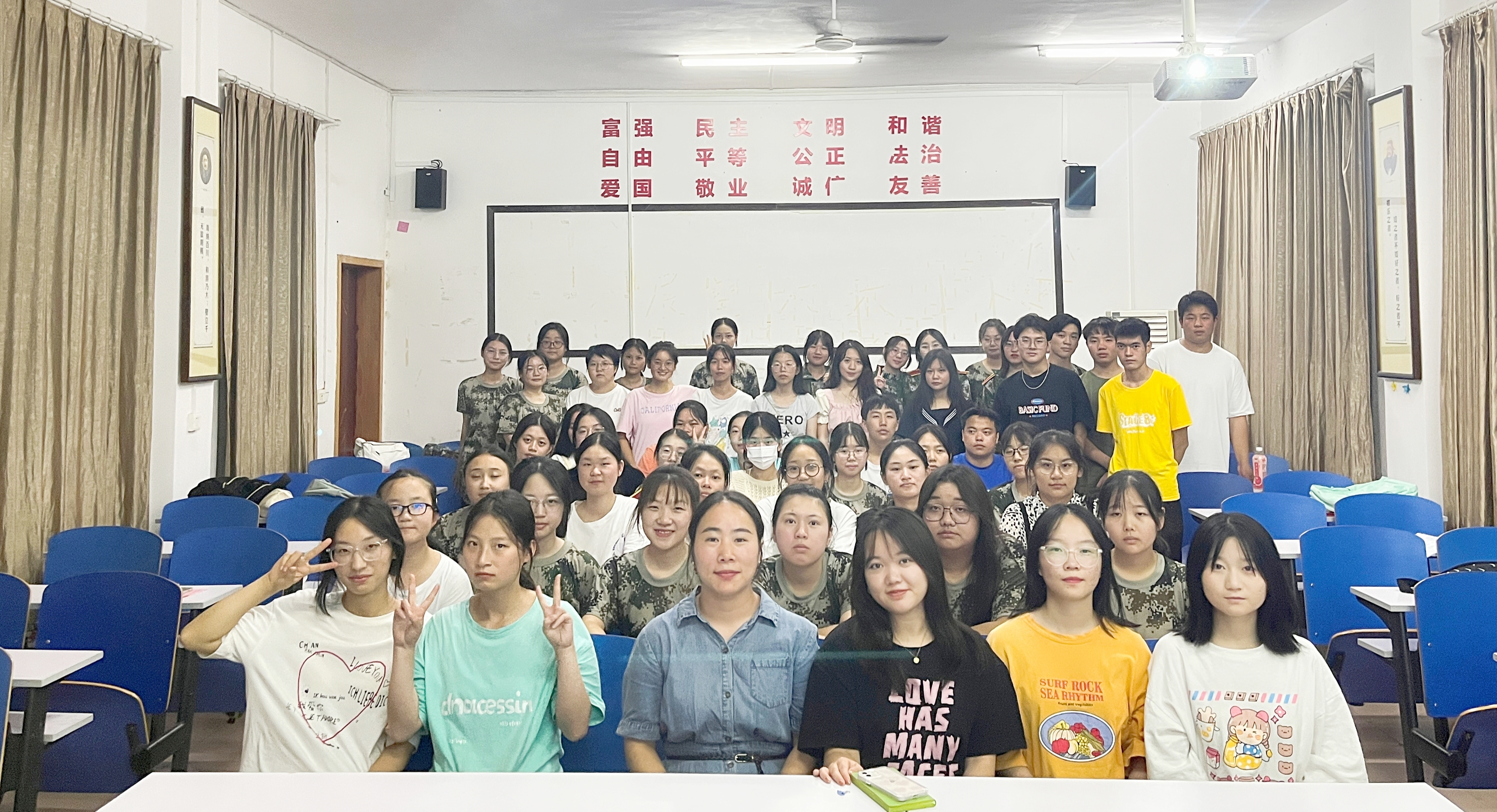 图为2201班班主任黄丽老师(左三)、学生副班主任杨文静与班级同学合影留念。