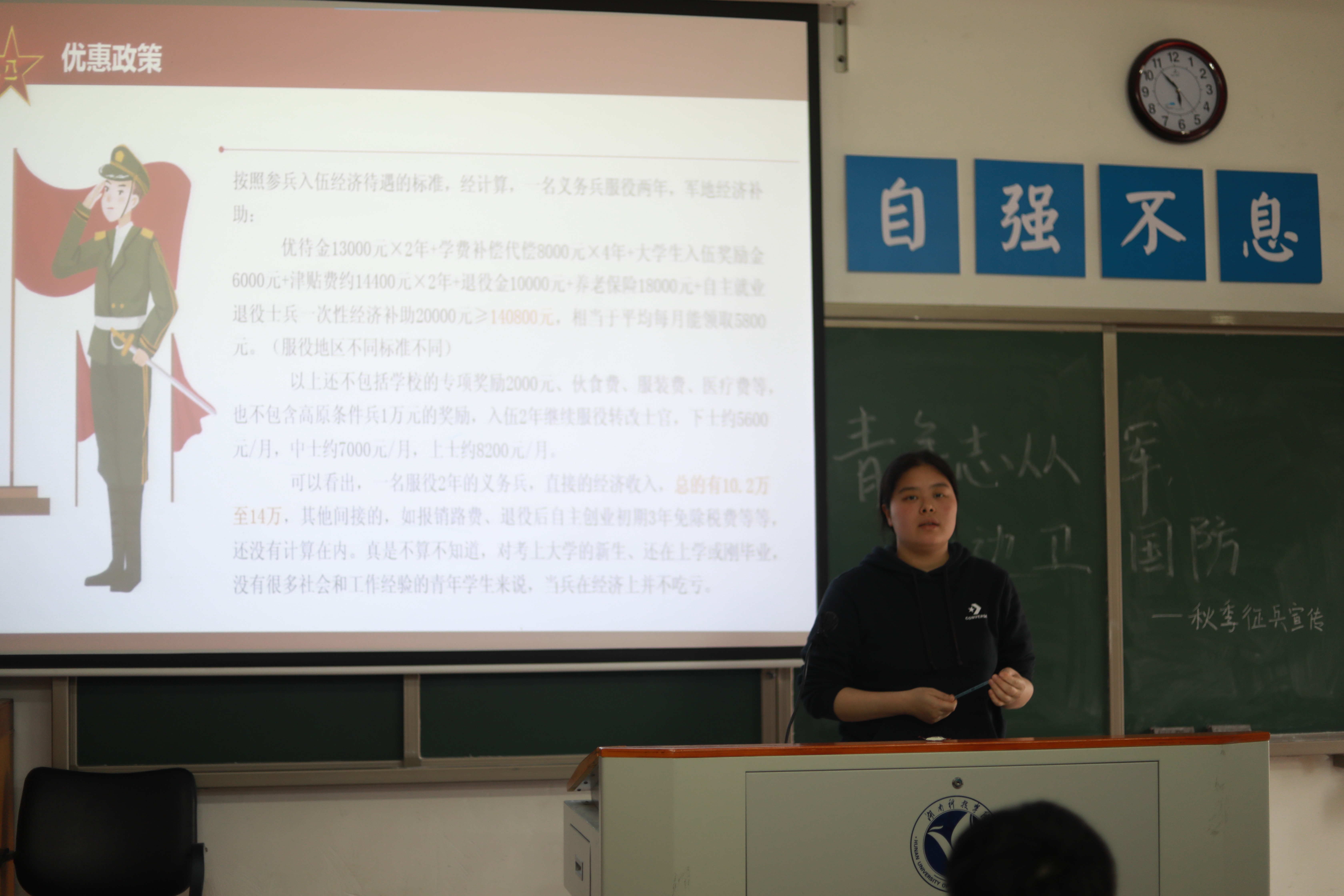 活动伊始,主持人首先简单介绍了付雄学长,接着同学们以热烈的掌声欢迎付雄学长进行讲解。首先,付雄向同学们讲解全国征兵网站、征兵基本的身体条件、应征入伍流程以及大学生入伍的优待和参军的优势,更形象地向同学们介绍大学生征兵的优惠政策,激励同学们积极应征。讲解过后,与同学们进行了一番交流,对同学们的问题进行答疑解惑,帮助同学们更加了解征兵内容,激发同学们参军入伍的热情。