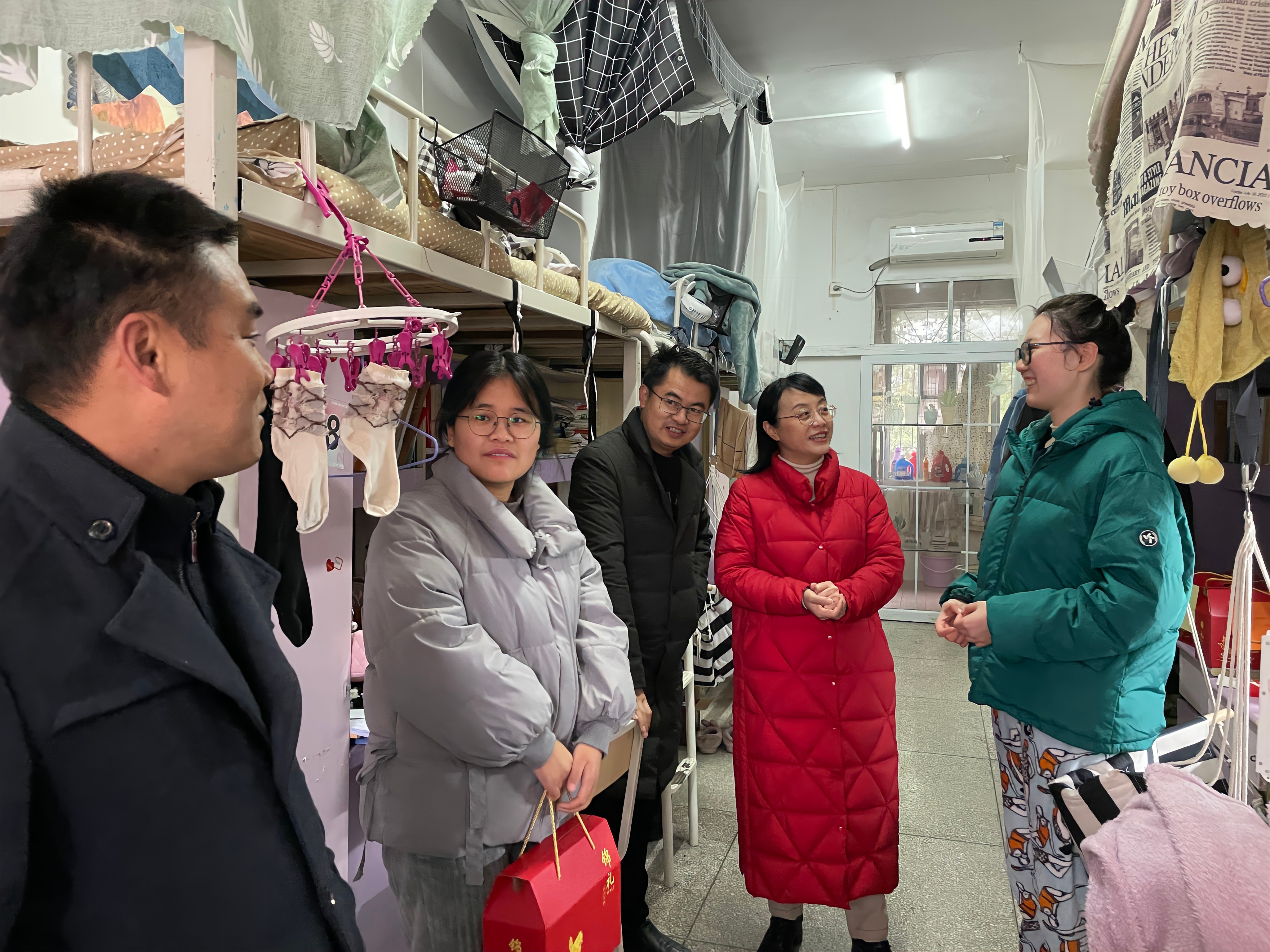 本网讯(记者 王婧)为振奋马克思主义学院考研学子士气,增强学生备考信心。12月21日,马克思主义学院院长廖雅琴、党总支书记郑向晖、党总支副书记兼副院长高丹、学工办主任王君及1801班班主任周梅、1802班班主任邓怡舟深入学生寝室,在冬至时节为我院考研学子送上考研福袋与暖心祝福。