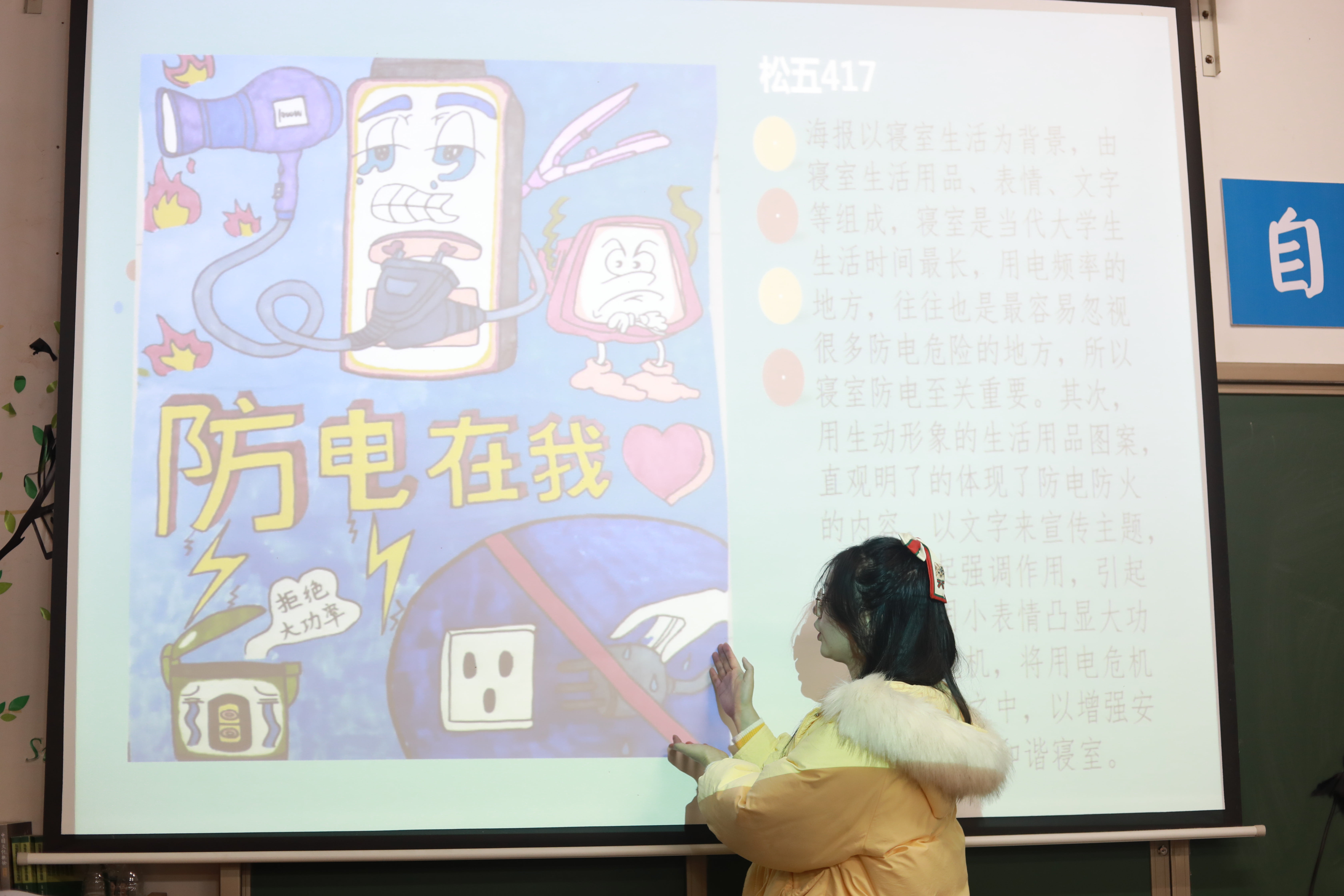 本次参赛的海报作品丰富多彩、色彩和谐、主题鲜明,突出了“防火”、“防电”和“防盗”的重点。荷园二栋混寝成员李钰晨同学介绍道:“‘火’既是光明又是魔鬼。”并用英文警示大家警惕寝室安全隐患;