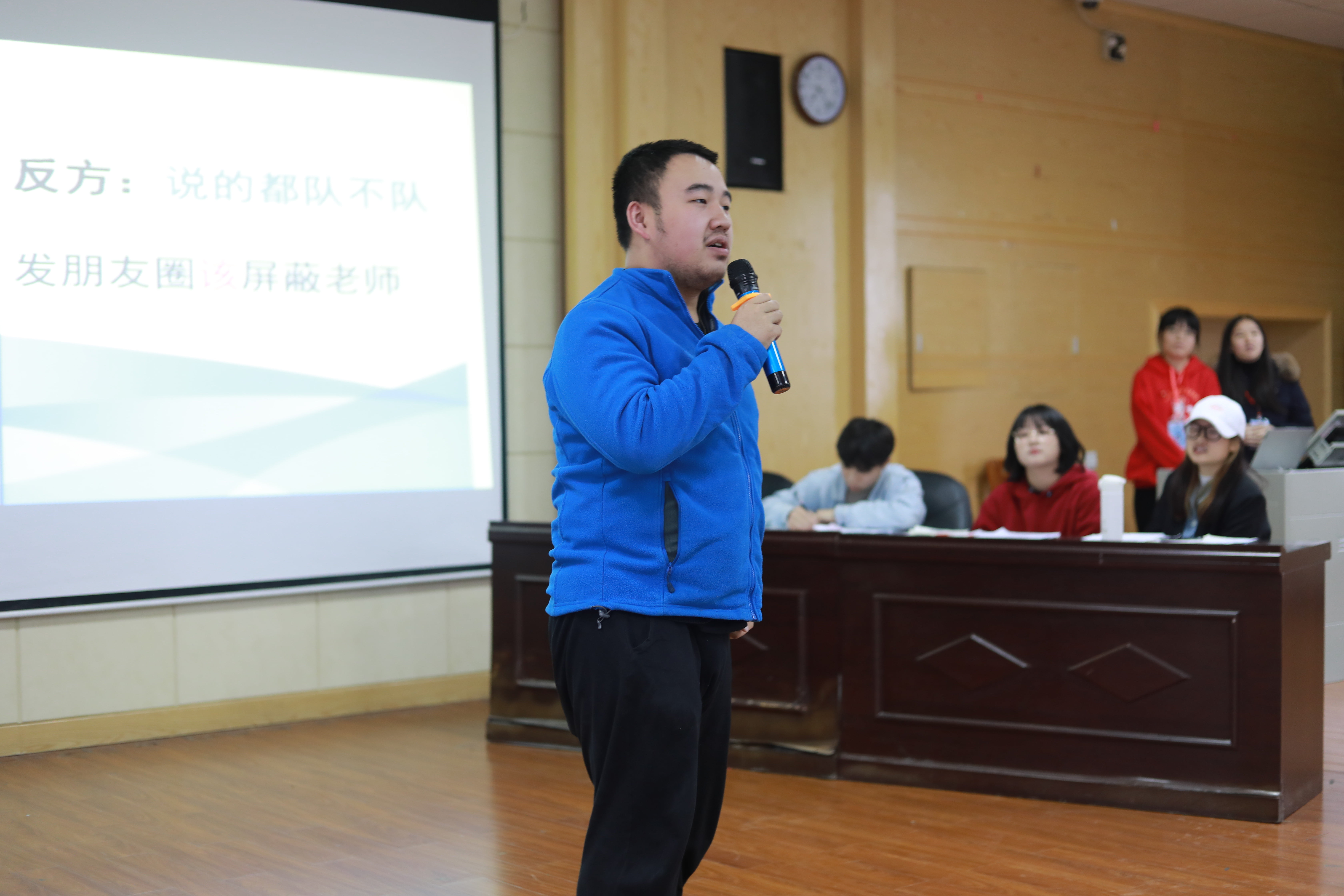 在最激动人心的自由辩论环节中,正方从多个层面分析朋友圈不屏蔽老师的好处,反方则以“不打扰也是一种尊重”观点进行辩论。反方四辩更是提出“朋友圈是我们生活的树洞”观点,力破对手防御,夺得本次辩论赛的冠军。