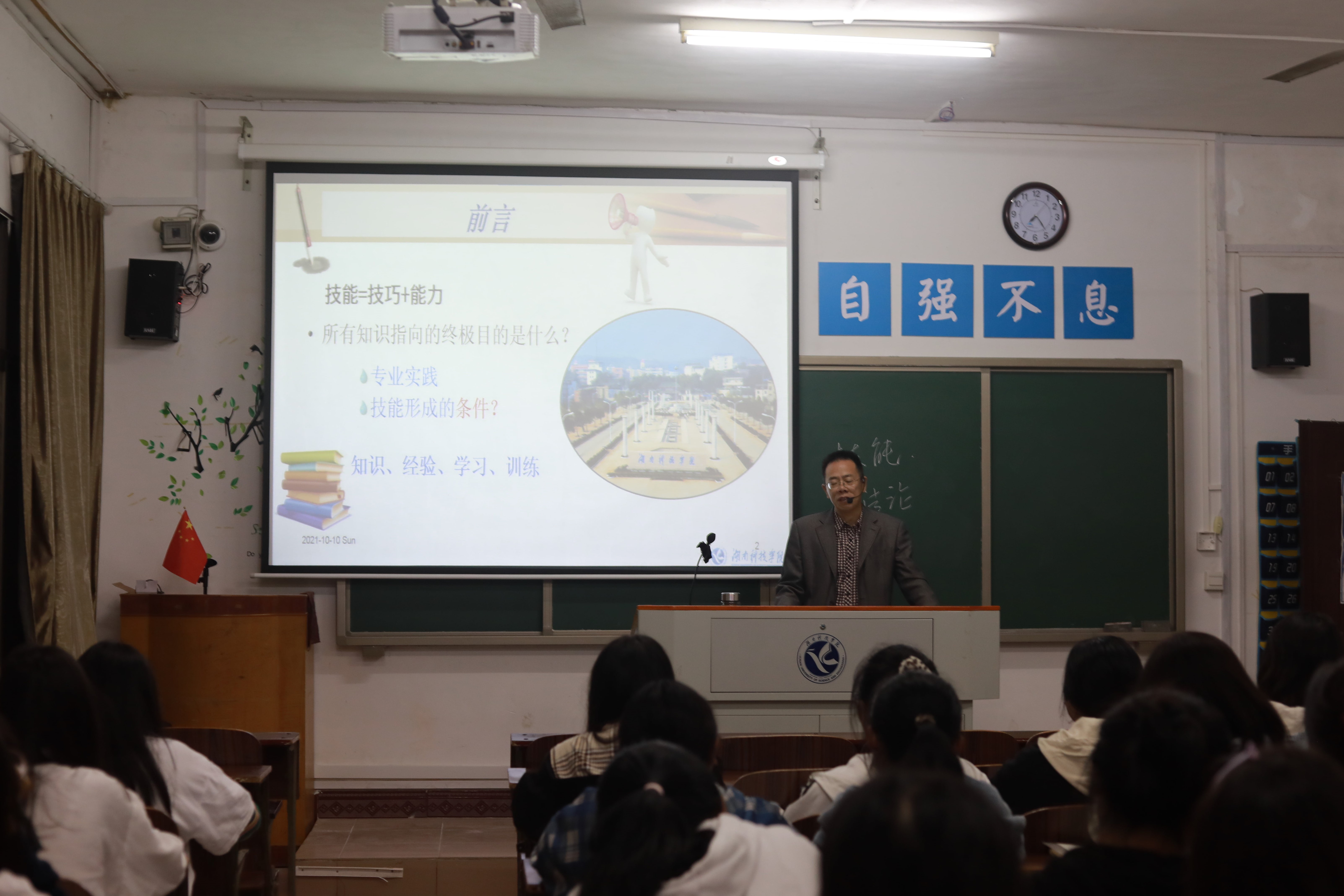 杨军以“高校师范生教学技能概述”为题,就硬件技能、隐性的软件技能、教师的基本素养三个方面展开论述,分析当代大学生就业形势及该如何从事教育行业,成为一名优秀的老师。他特别指出,教师需要具备道德素养、知识素养、能力素养。道德素养摆在第一,以德为先,以身作则,才是一个优秀教师的标准。在讲述道德的重要性时,他引用习近平总书记的话——“三观,是人生的总开关。”希望同学们在大学树立远大目标,端正学习态度,不负美好时光。