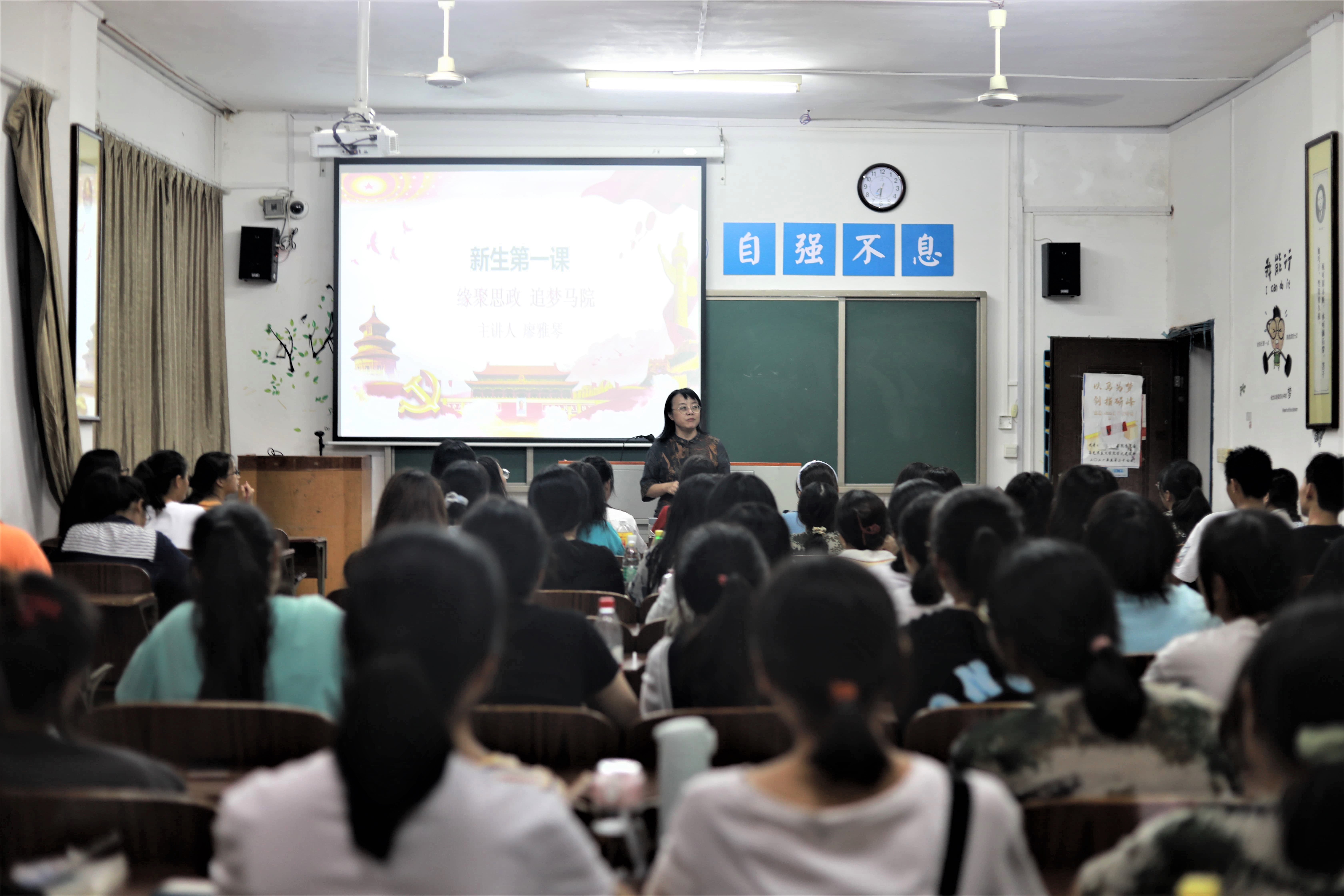 本网讯(记者 谢姣娇)2021年9月17日,马克思主义学院于鹤鸣楼501教室举行新生第一课——“缘聚思政 追梦马院“讲座,此次讲座由马克思主义学院院长廖雅琴主持,21级全体同学参加。