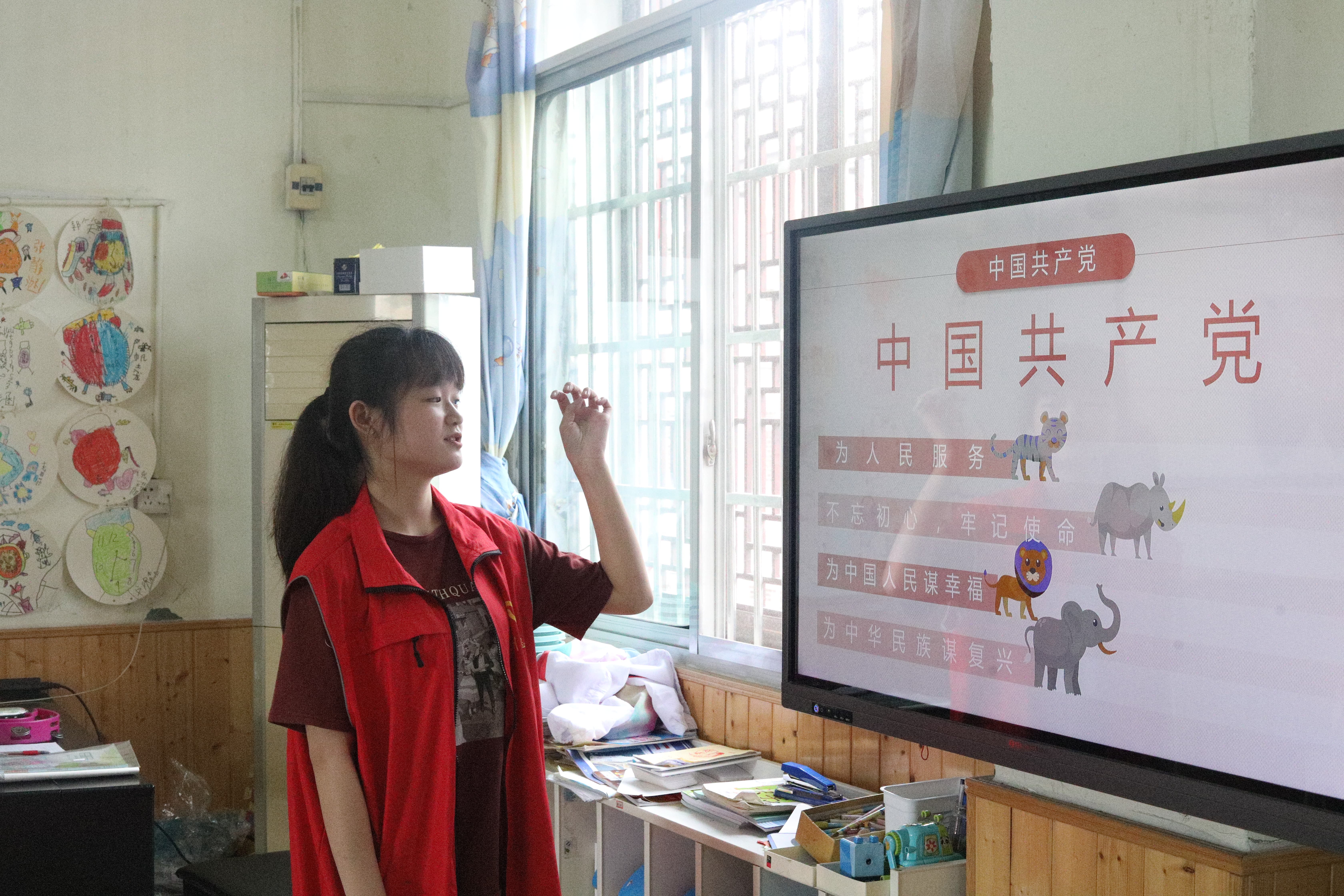 唱支红歌给党听,志愿者组织全班儿童学唱《祖国祖国》红色歌曲,“祖国祖国我的家,五星红旗迎风扬,冉冉升起的是希望…”以稚嫩歌声礼赞祖国。