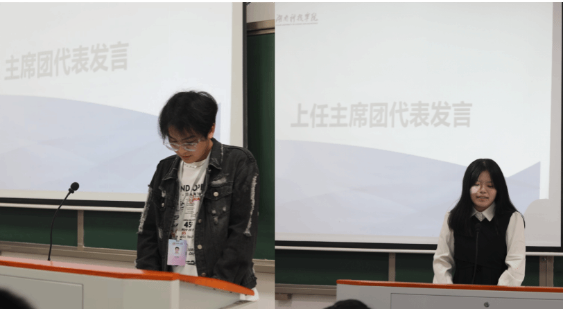 会上,高丹、曹惠如为上一届团学联干部颁发聘书,团学联学生会执行主席许圣翰分享自身成长历程以及工作经验与心得,明确提出团学联成员在工作中要严于律己,以积极饱满的态度为学院、为老师、为同学服务。随后,上一任团学联青志团团长施欣欣围绕自信、责任、成长三个关键词,讲要努力工作,勇敢抓住机会,做到从量变到质变;要无私奉献服务于同学,大胆去做;要在团学联中吸取经验,不断成长。