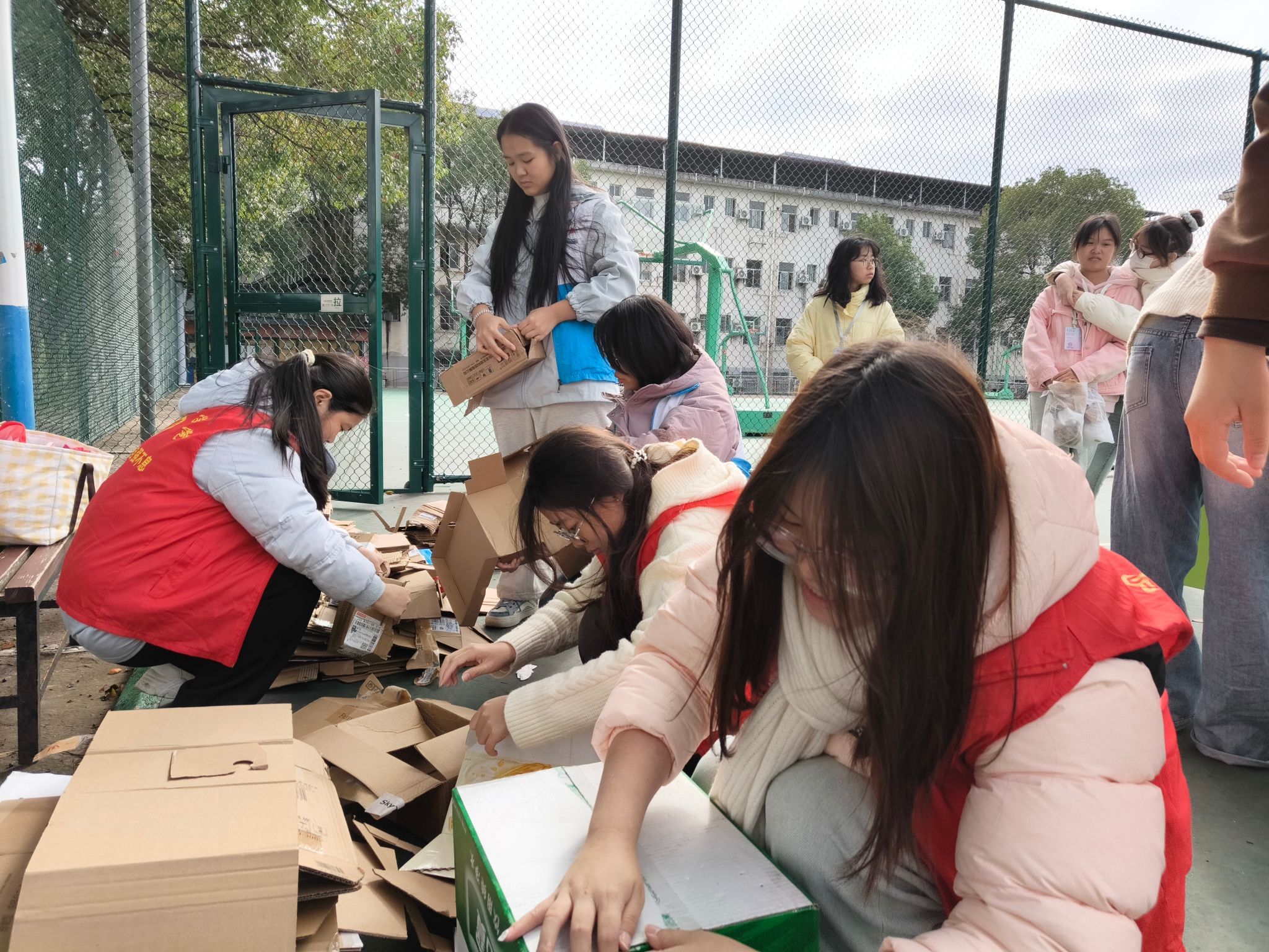 在活动期间,志愿者们在预定的站点接收同学们捐赠的纸盒,并负责对这些纸盒进行整理、清点和确认。