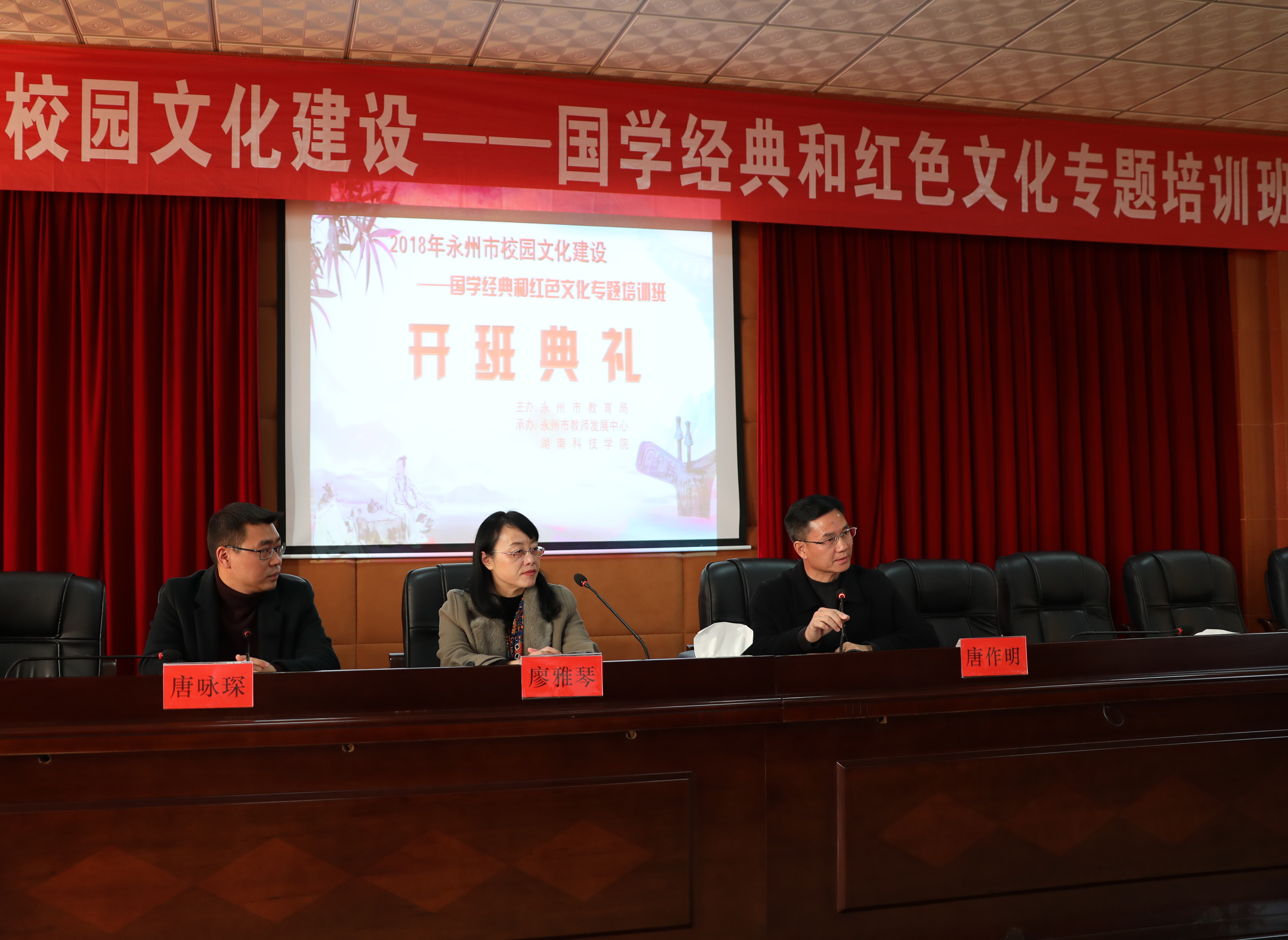 本网讯 (通讯员 李艳) 为切实落实学校立德树人教育根本任务,促进校园文化建设内涵发展,12月17日,永州市校园文化建设——国学经典和红色文化专题培训班在我校开班。永州市教师发展中心主任唐作明、教研员唐咏琛及马克思主义学院院长廖雅琴等参加了开班仪式,来自全市各县区、直属学校的135名中小学教师参加了本次培训。