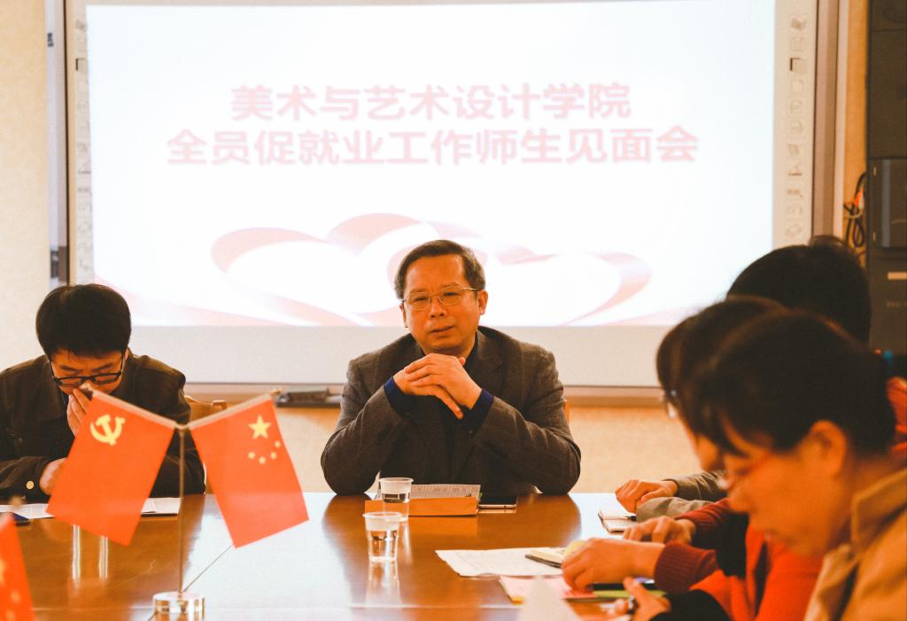 本网讯11月28日上午,美术与艺术设计学院在美术楼南楼202会议室召开了本年度全员促就业工作师生见面会。学校副校长郑山明、学校资产管理处副处长谷利民、美术学院院长张建利以及全体全员促就业指导老师、学生代表出席了会议。