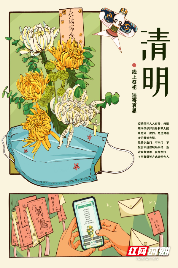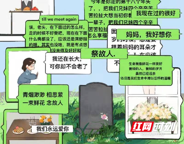 红网时刻新闻4月4日讯(通讯员 宁央贝 黄宇莹)清明将至,哀思渐浓。然疫情防控形势严峻复杂,为倡导文明祭扫新风,传承优良家风。4月2日,九游在线美术与艺术设计学院学生以绘画的形式提倡大家清明扫墓采用网上“云祭扫”、居家追思、植树缅怀等绿色、环保、安全的祭祀方式进行。