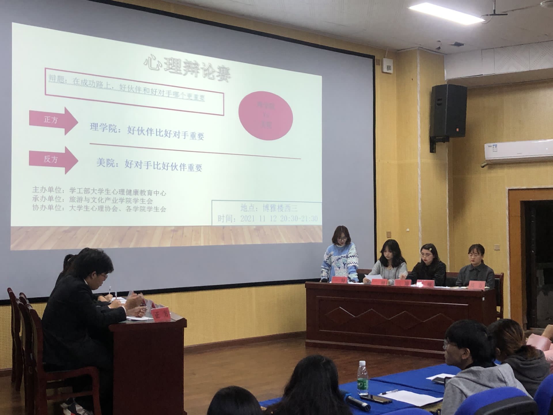 本网讯(通讯员周怡君)2021年11月12日晚,九游在线于博雅楼开展了八强进四强的辩论赛。本次辩论赛,主办单位为学工部大学生心理健康教育中心,承办单位为旅游与文化产业学院学生会,协办单位为大学生心理协会及各学院学生会。本次辩论赛的辩题为“在成功路上,好伙伴和好对手哪个更重要”,正方为持“好伙伴比好对手重要”观点的理学院与持“好对手比好伙伴重要”观点的美院。