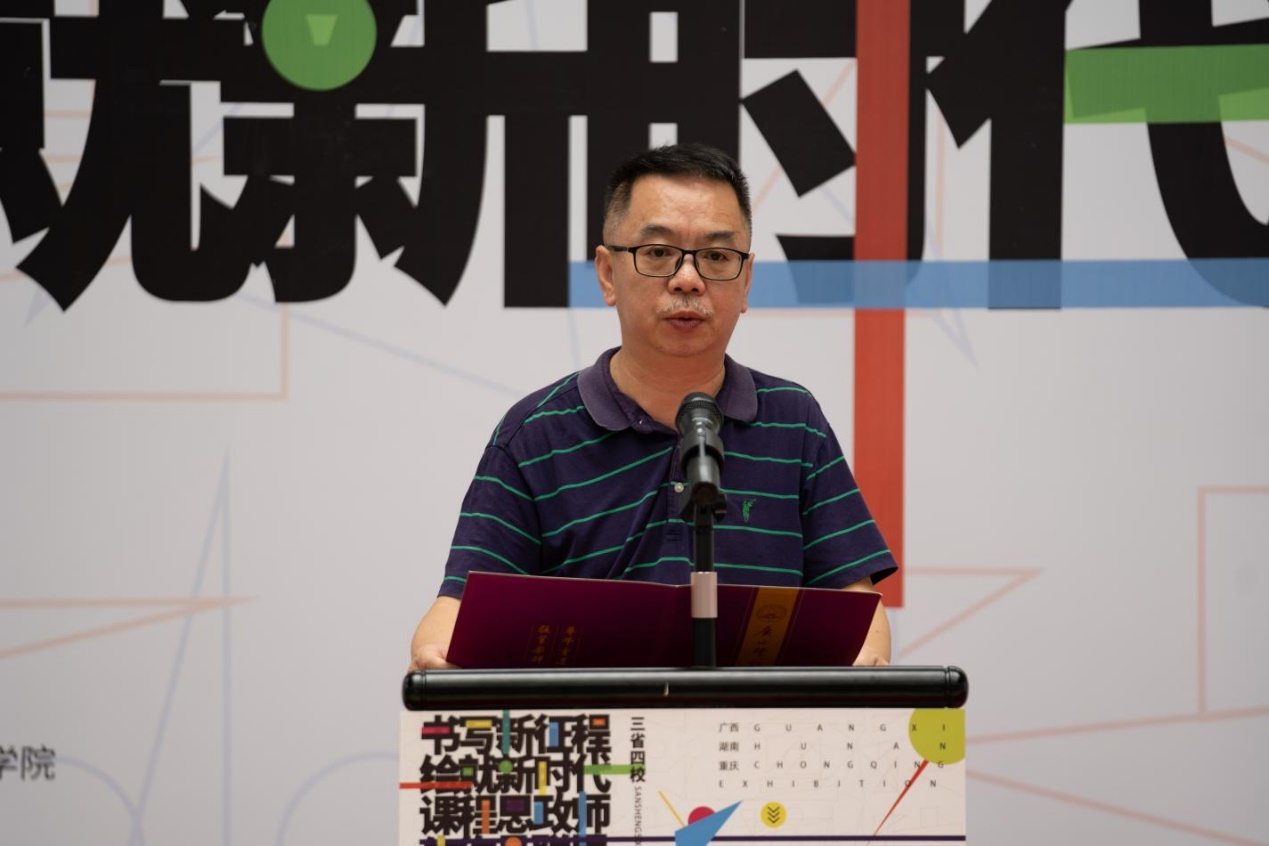 本网讯(通讯员 唐天田)7月1日,由广西师范大学美术学院、西南大学美术学院、九游在线美术与艺术设计学院、河池学院美术与设计学院联合主办,广西师范大学校党委宣传部、美术学院联合承办的“书写新征程,绘就新时代”三省四校课程思政美术作品联展在广西师范大学纯道楼展厅开幕。我校美术与艺术设计学院院长张建利出席开幕式并致辞。