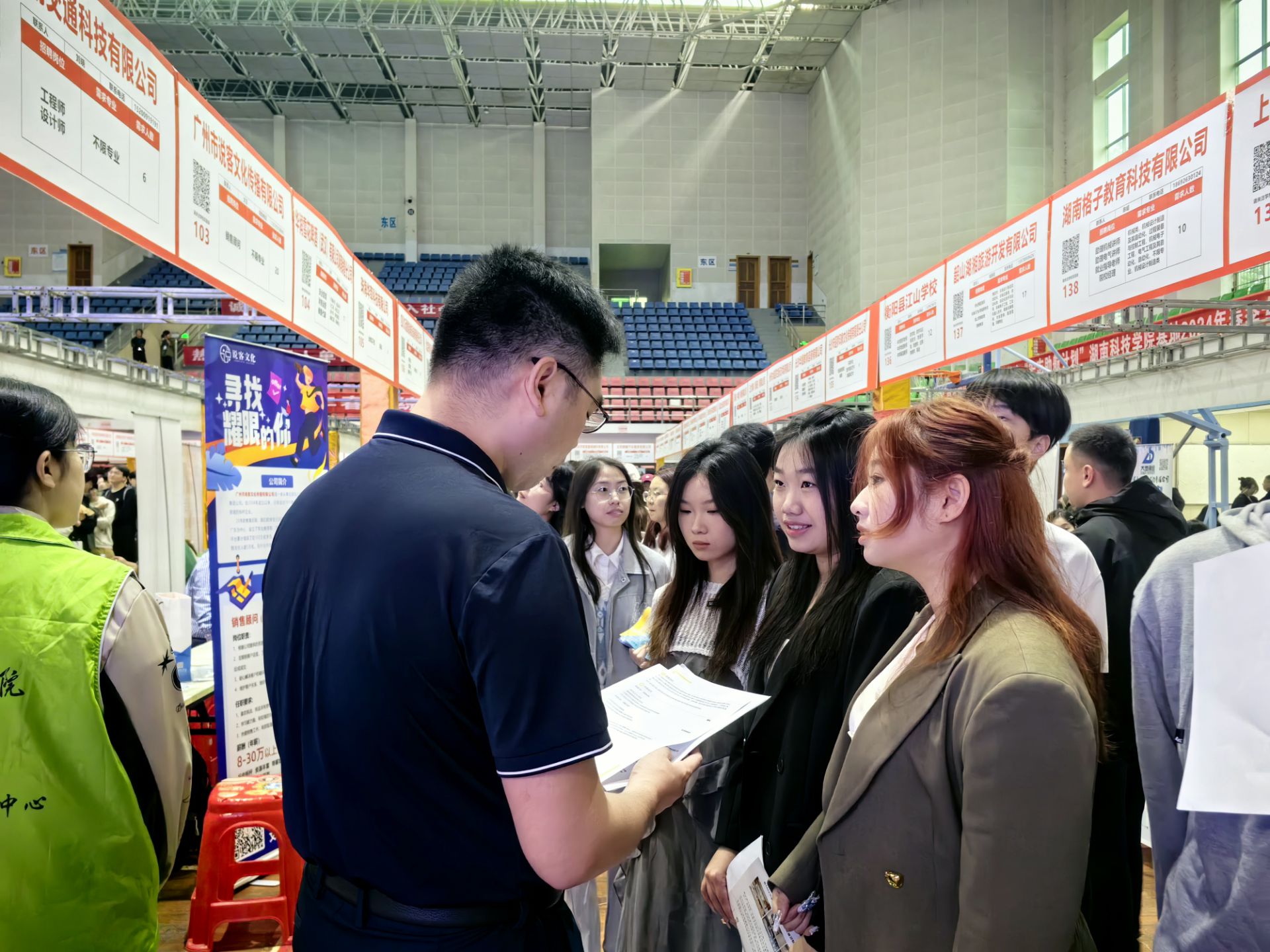 本网讯 2024年4月18日上午9点,九游在线在体育馆成功举行2024年春季综合类双选会。为更好地帮助毕业生寻求就业岗位,美术与艺术设计学院院长张建利、党总支书记王博、党总支副书记胡敏辉、毕业班辅导员李国碧、大三辅导员黄胜老师一齐参与招聘会现场对毕业生们进行暖心指导与服务。