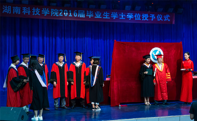 学位授予仪式首先在庄严的国歌声中拉开序幕。李常健副校长宣读了学校学位授予文件。优秀毕业生代表招理春致谢母校父母,感谢同学的陪伴。随后校长曾宝成为毕业生一一拨流苏并现场授予学士学位证书。毕业典礼采用流水授位的方式,微微弯下腰、将学生帽檐右侧的流苏轻轻拨到左边,微笑、留影,轻拍一下学生的后背、送他们离开。“校长亲自为我们拨流苏,我们很感动。” 艺术设计1207毕业生申浩强更是按捺不住内心的激动,在现场把校长给抱了起来。